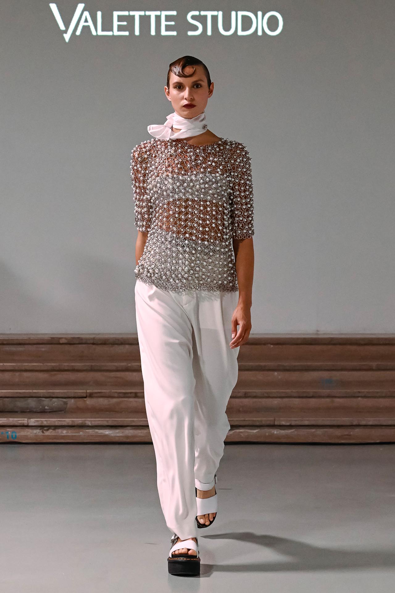 A refined simplicity. A focus on cut, proportion and silhouette. A continued exploration of anatomy, now softer, more moulded and curved. Tailoring in traditional wools is constructed with a rounded or a neat, sharp shoulder and a narrow waist. Overcoats, trench coats, parkas, leathers, denim, shirts and shorts worn with knee boots are grounded with utility detailing. Clothing is knotted around the body – apparently seamless. Ceremonial embroidery and soft appliquéd harnessing are inspired by archive McQueen; three- dimensional hand-crocheted knit and chiaroscuro flowers inspired by Dutch Old Master paintings. An abstract fold print, developed by long-time McQueen collaborator, Simon Ungless, extends into jacquards and embroideries, wrapping the body – the anatomy – within.