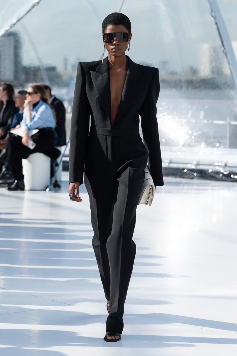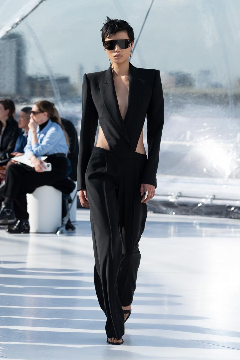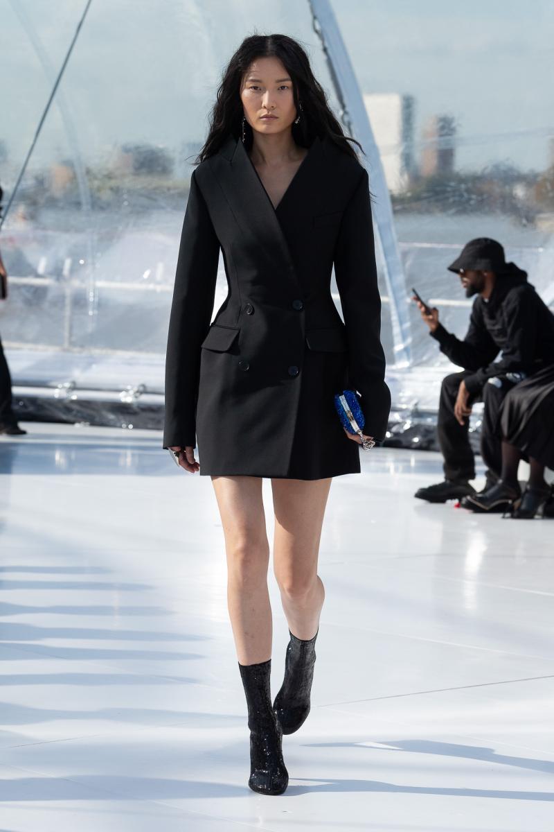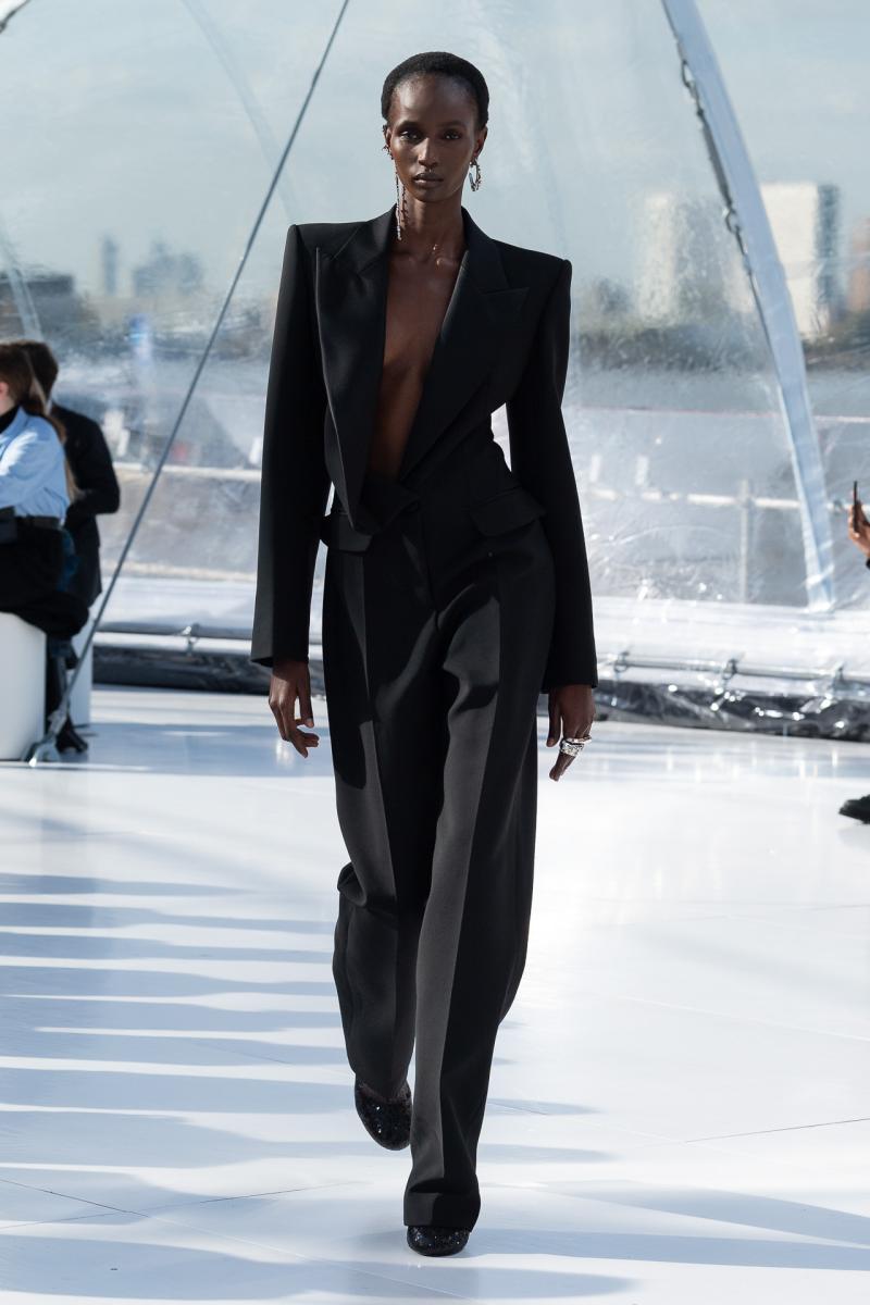 Titled “First Sight,” the Alexander McQueen Spring/Summer 2023 women’s collection was unveiled in a clear-domed runway set amidst the grounds of The Admiral’s House, Old Royal Naval College in London. With the opening look featuring a giant eye on a black mesh/draped dress and a waist-high leg reveal, one beautifully tailored and sophisticated look after another wound its way through the enclosed, circular and intimate setting.