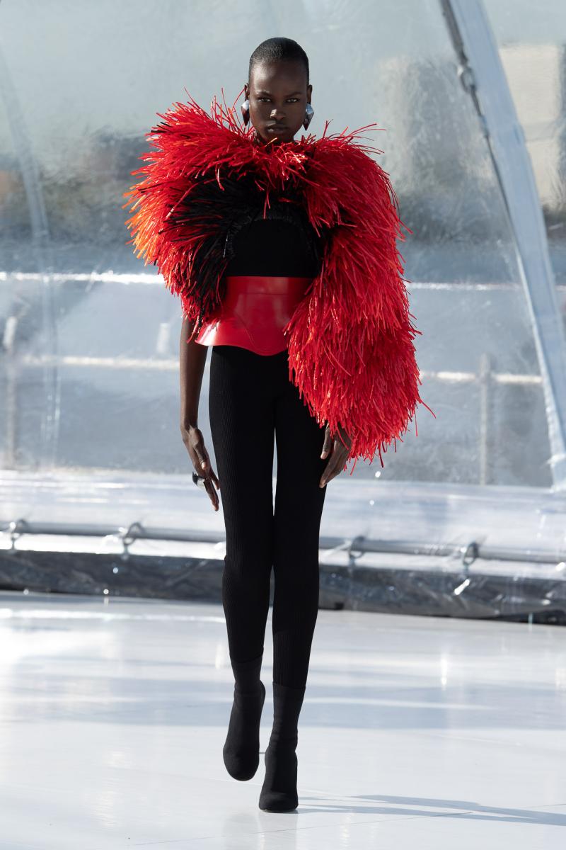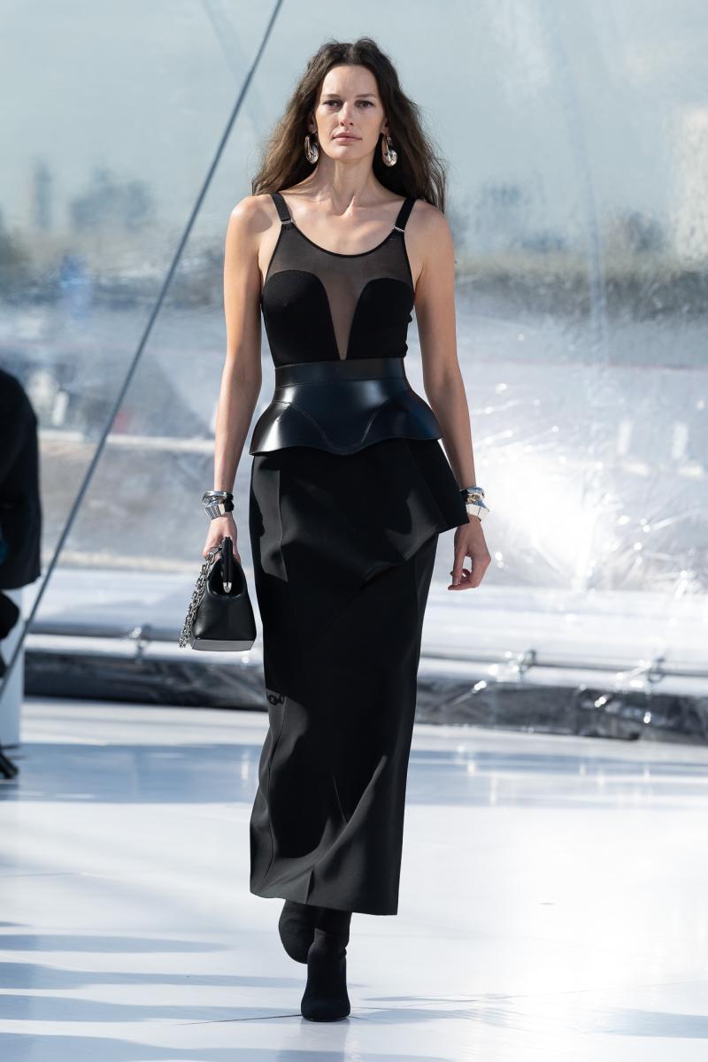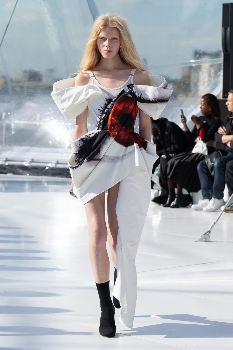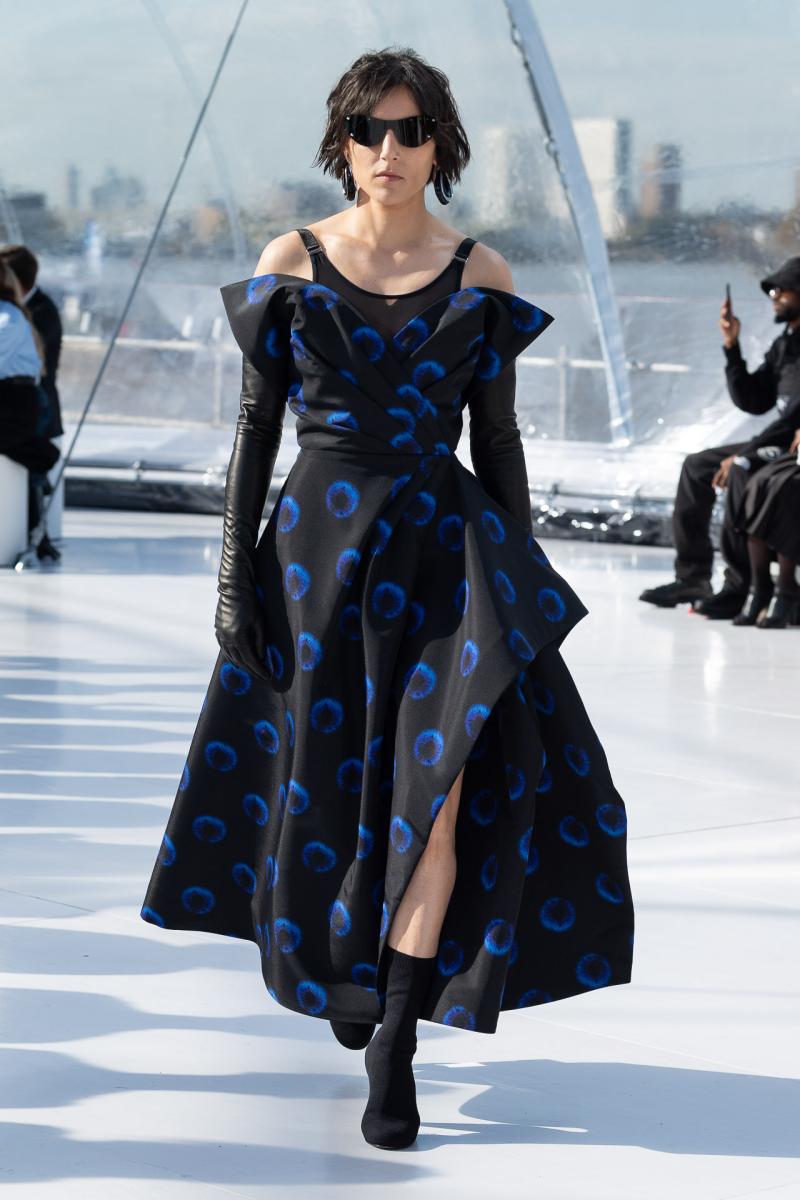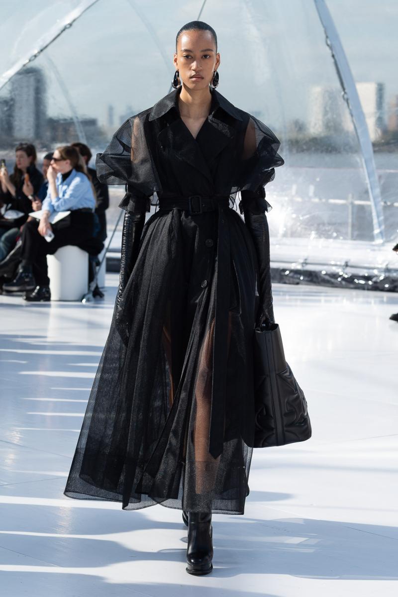 Titled “First Sight,” the Alexander McQueen Spring/Summer 2023 women’s collection was unveiled in a clear-domed runway set amidst the grounds of The Admiral’s House, Old Royal Naval College in London. With the opening look featuring a giant eye on a black mesh/draped dress and a waist-high leg reveal, one beautifully tailored and sophisticated look after another wound its way through the enclosed, circular and intimate setting.