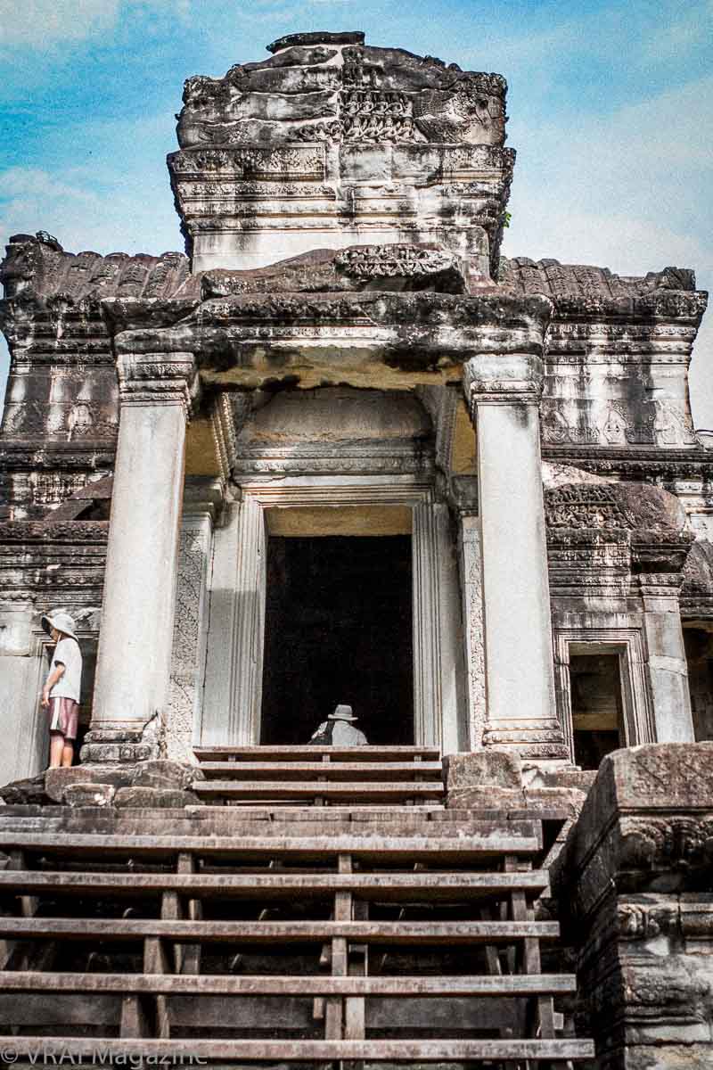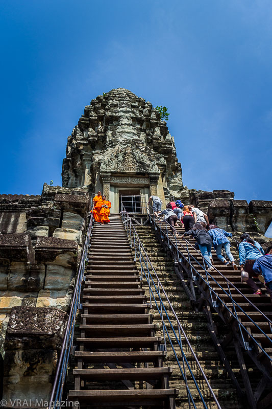 Progressing further into Angkor Wat required us to continually climb up at each new section. Finally at the center, I looked up and faced a set of incredibly steep wooden steps that every visitor would need to ascend to get to the very center of the complex. Unfortunately, due to the sharp angle, anyone under 12 was not allowed to climb. The nephews stayed behind with GrandPa and our guide as the rest of us made our way up. I was glad they had constructed the wooden steps — my big feet would never have made it up the original, narrow stone steps.