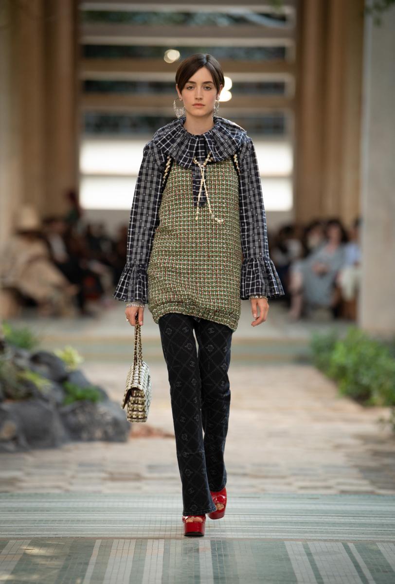 The latest collection is filled with plant motifs, geometric shapes, sparkles and sequins, and delicate lace intertwined with beautiful color in a range of looks from long, fitted coats to oversized sweatshirts. Exquisitely crafted with signature embroidery to multi-colored tweeds, and accented with flared trousers, platform shoes and collars, the spirit of the 70’s was evident throughout. What started out with the tailored elegance and refined silhouettes we except from CHANEL, the overall collection beautifully blended a bolder, more vibrant, and textured tonality reflective of the spirit of Dakar as well as the continued influence of streetwear.
