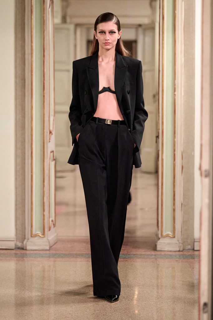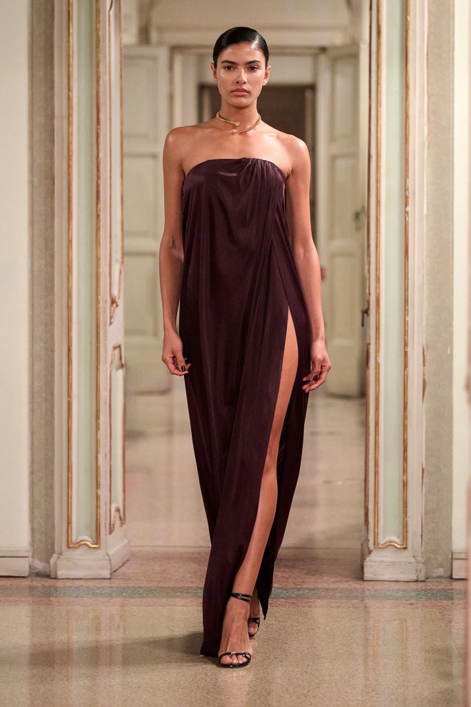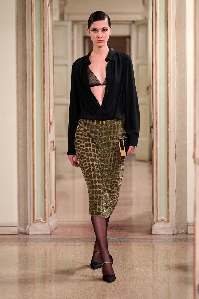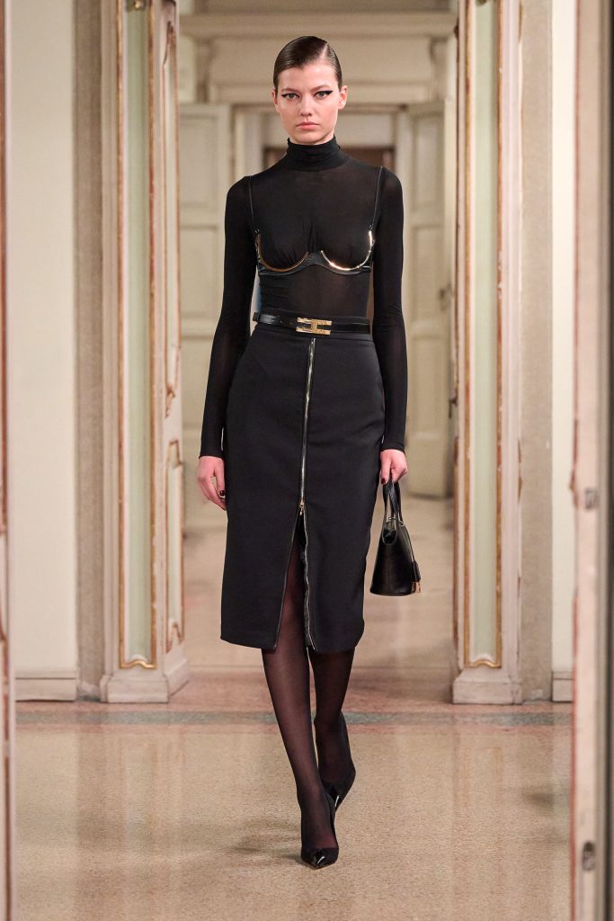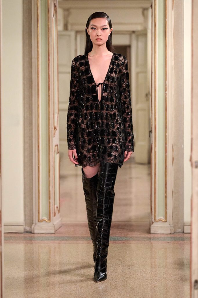 “This collection is a tribute to the strength and freedom of women who are unafraid to express themselves, who embrace their sensuality with confidence and determination. I chose Palazzo Acerbi as the venue for this show — a place that speaks of opulence and audacity. Through its rooms, I wanted to bring to life a femininity that is both elegant and disciplined, assertive yet provocative. Every piece tells the story of a woman who challenges conventions with grace, never compromising her own power.” — Elisabetta Franchi.