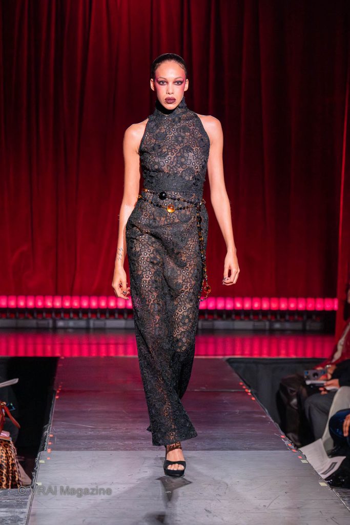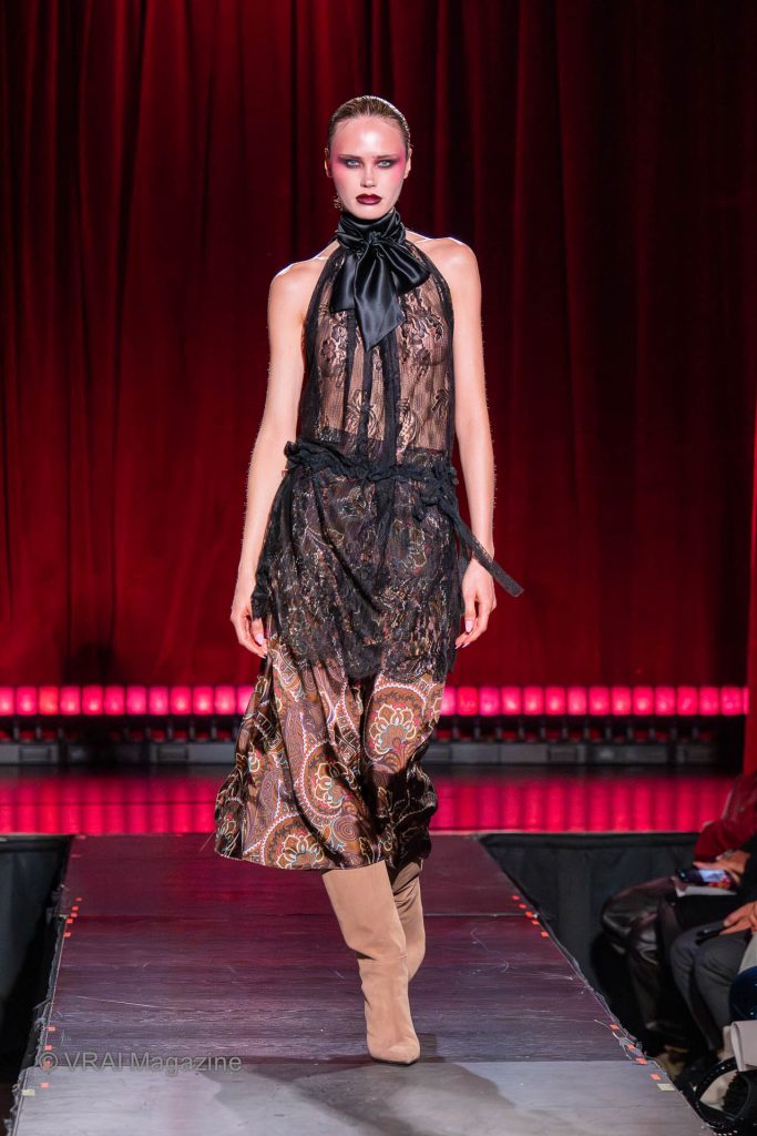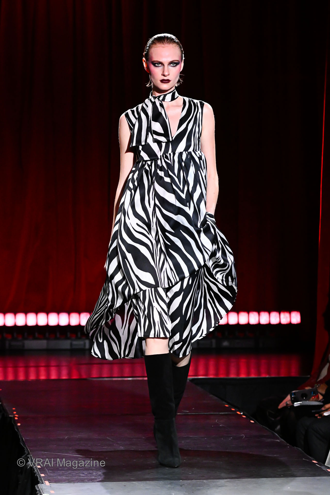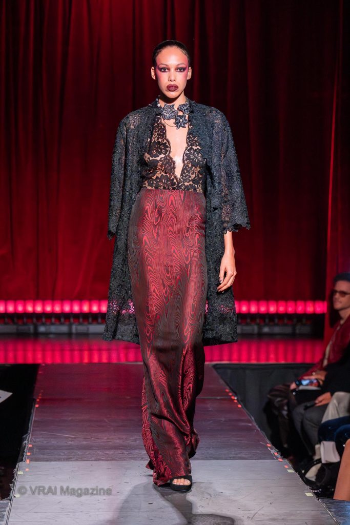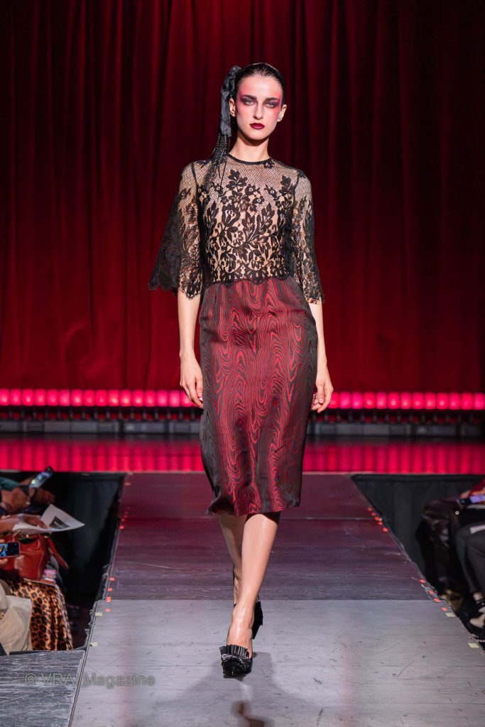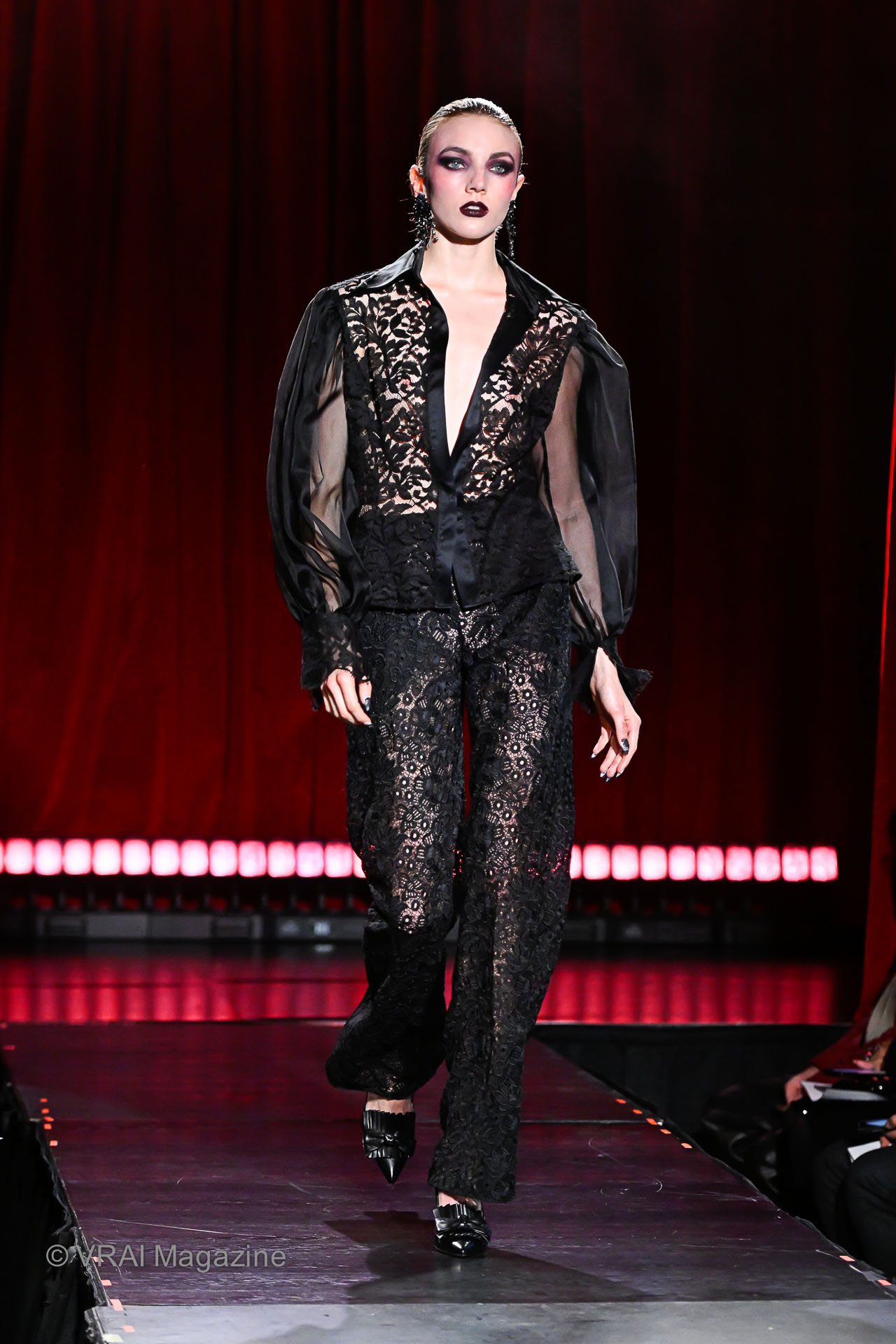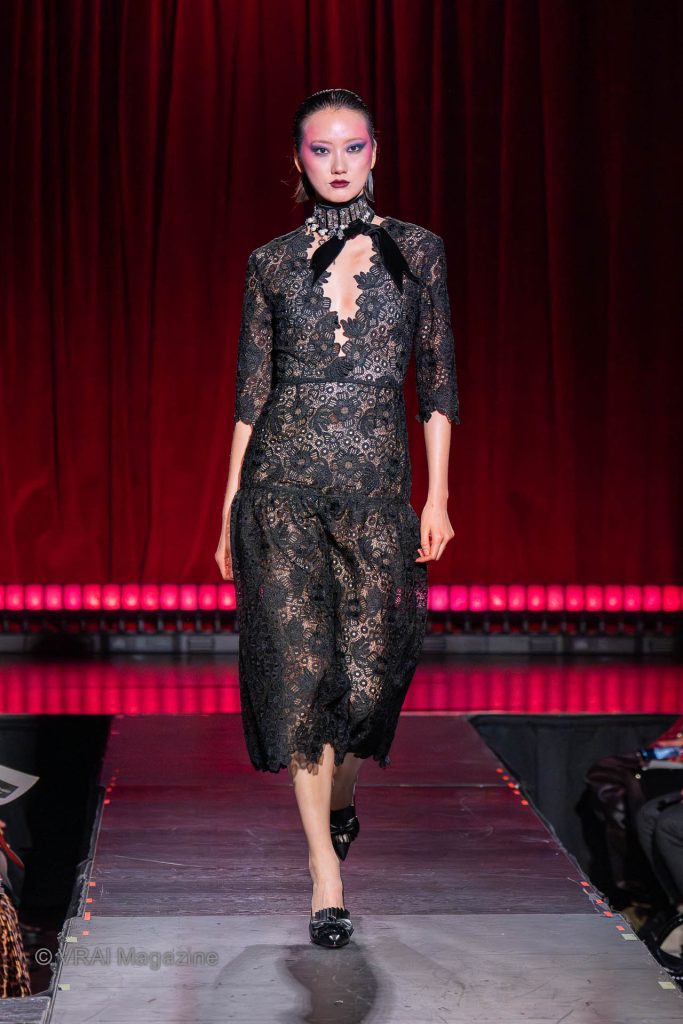 Anderson’s latest collection, a love letter to Spain and titled “Romance” was filled with intricate lace inspiration, a dark and moody palette of black, blood red and olive, zebra and floral prints, and sheer, seductive styling. The finale look was a halter dress in red with oversized bow and ruffles.