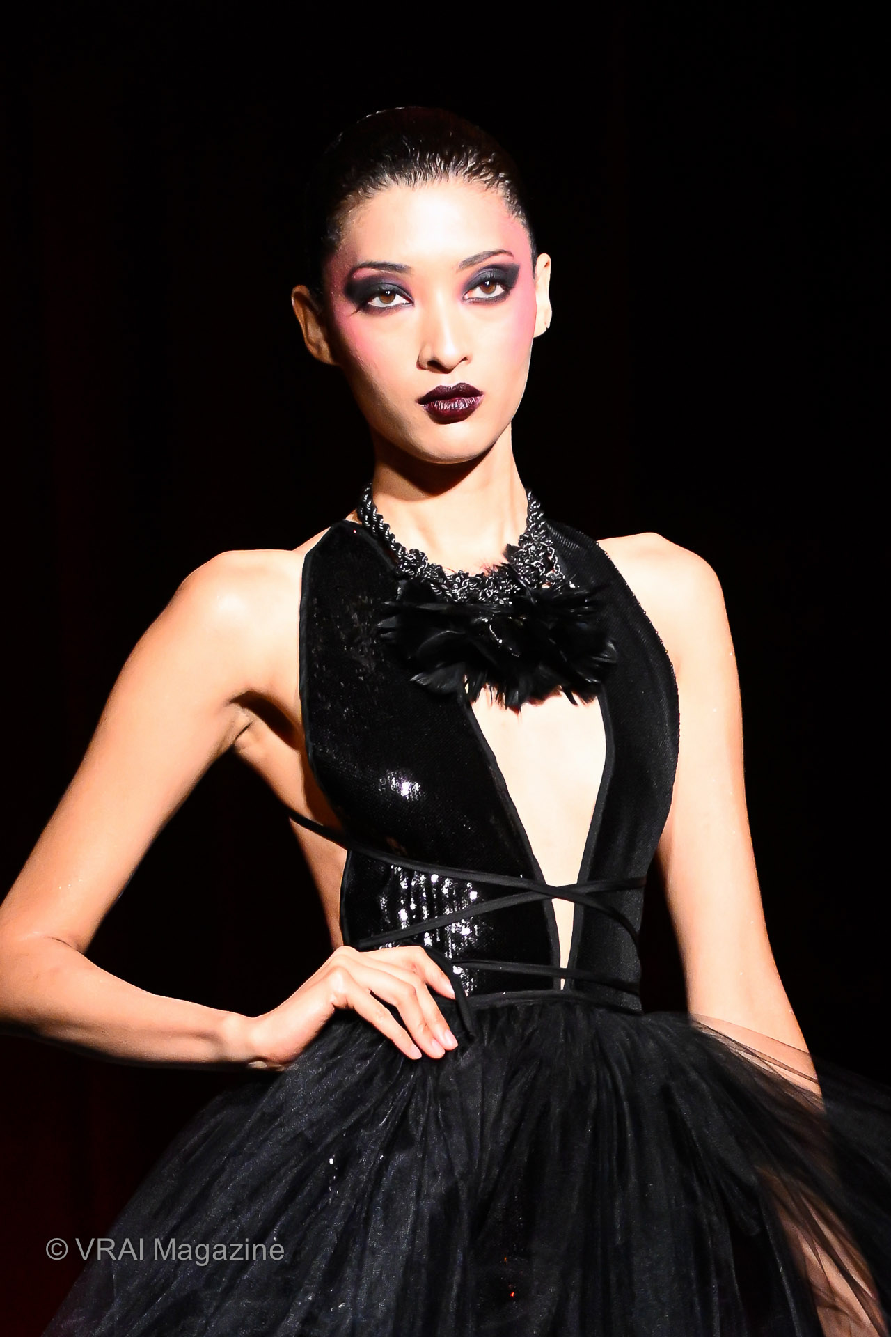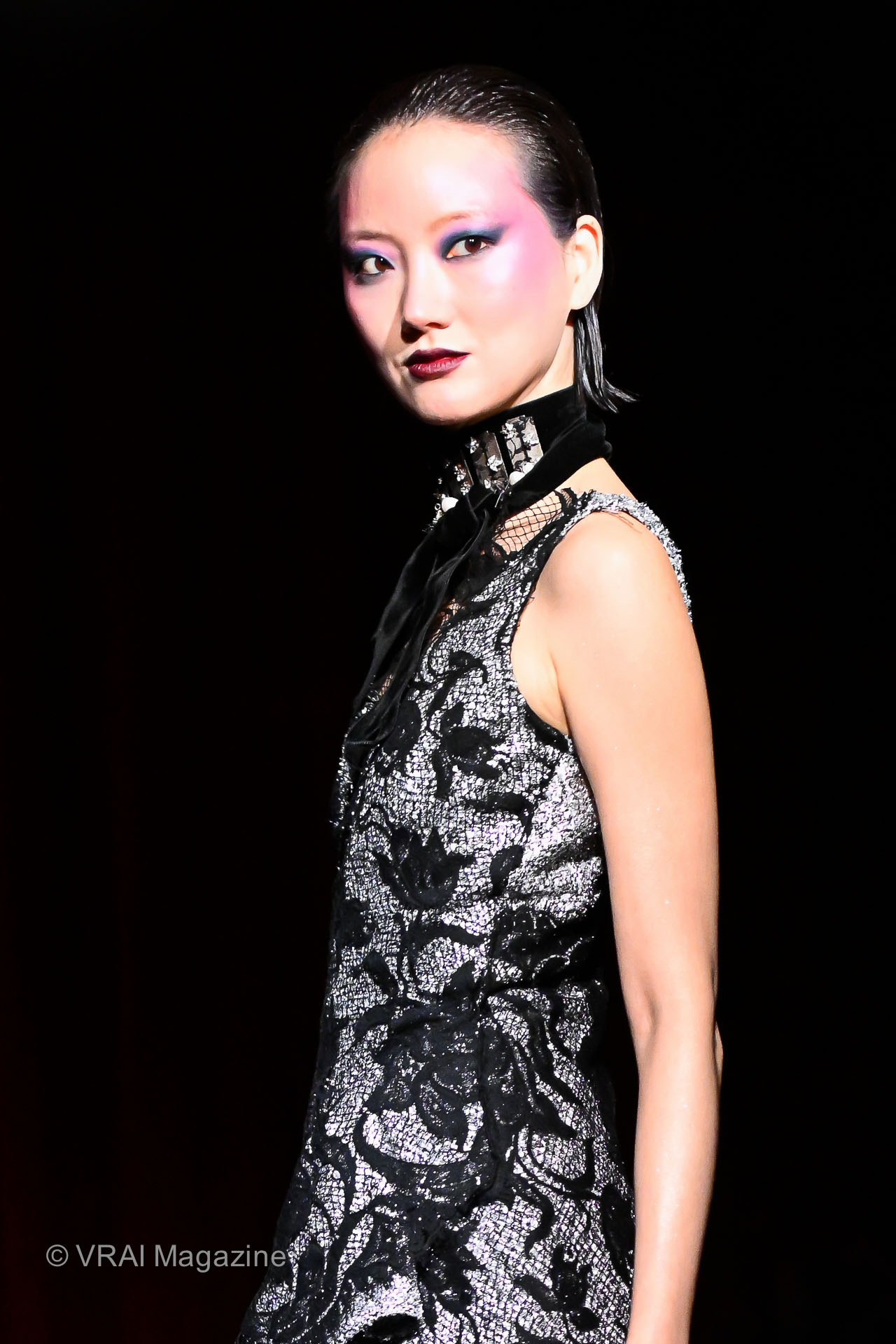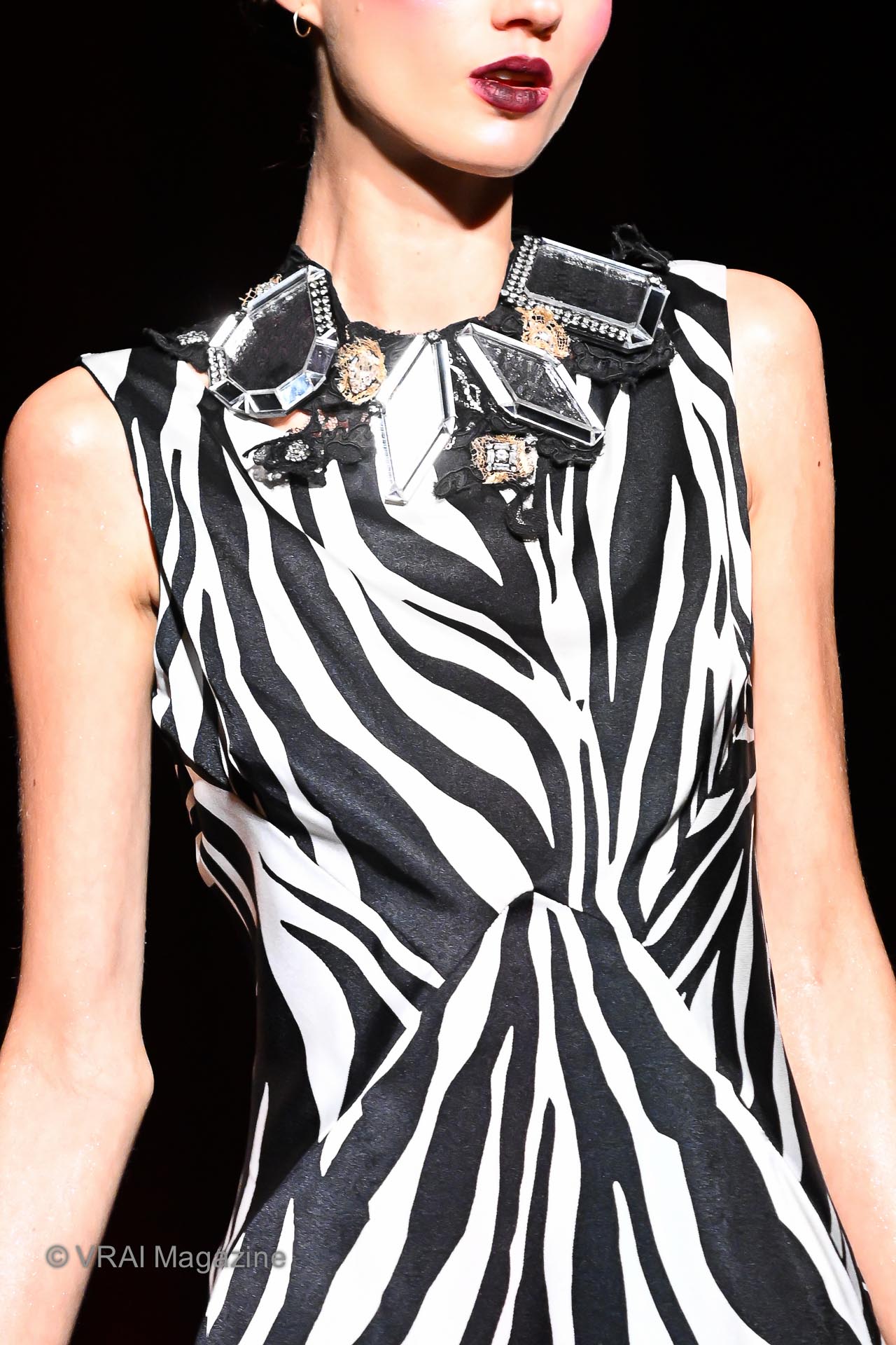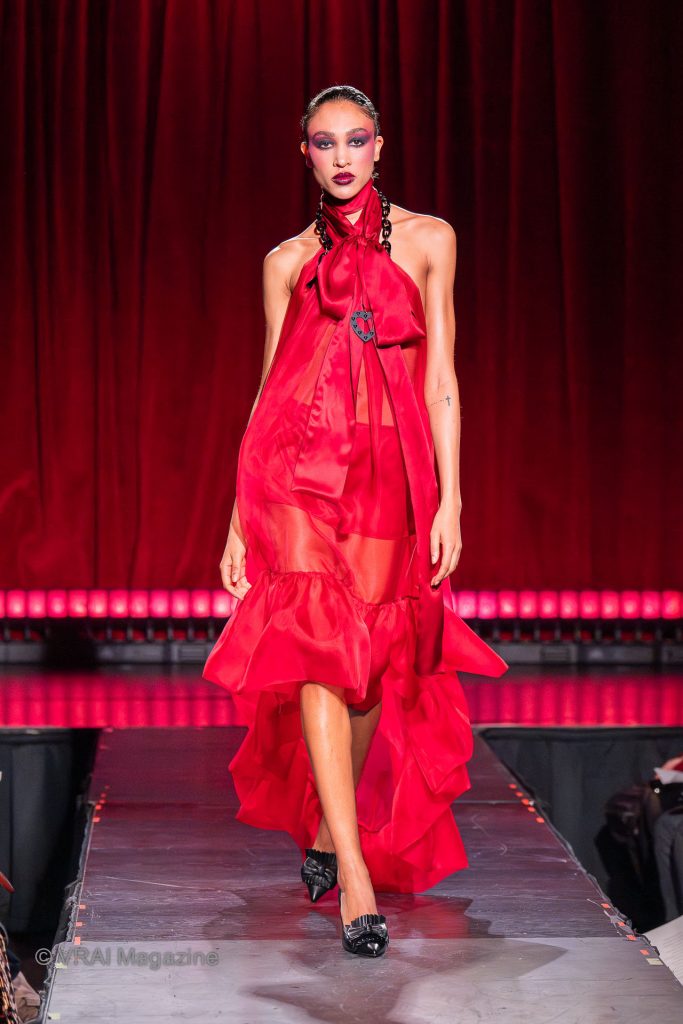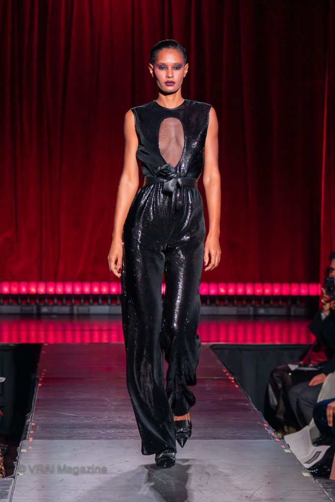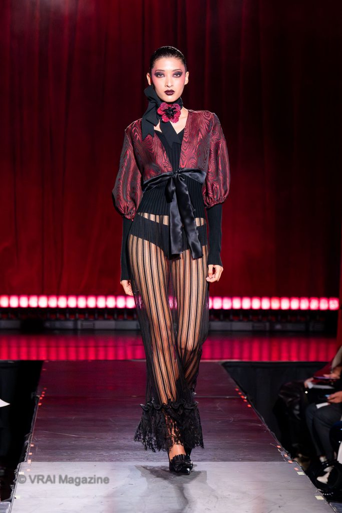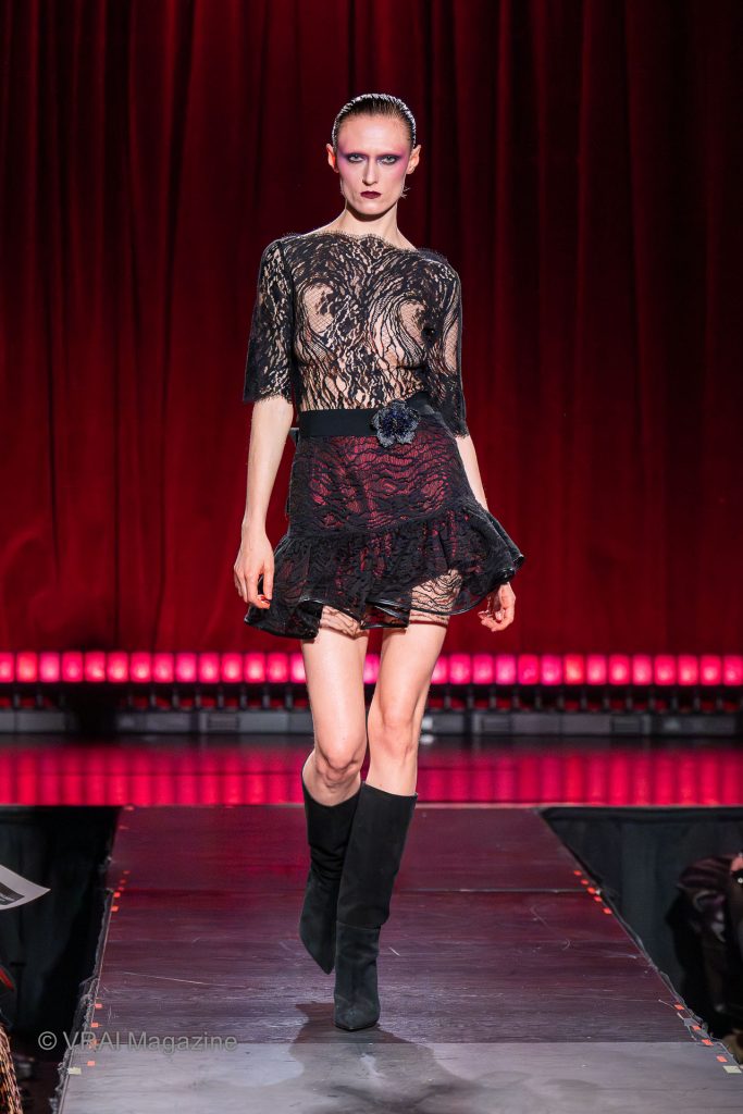 Anderson’s latest collection, a love letter to Spain and titled “Romance” was filled with intricate lace inspiration, a dark and moody palette of black, blood red and olive, zebra and floral prints, and sheer, seductive styling. The finale look was a halter dress in red with oversized bow and ruffles.