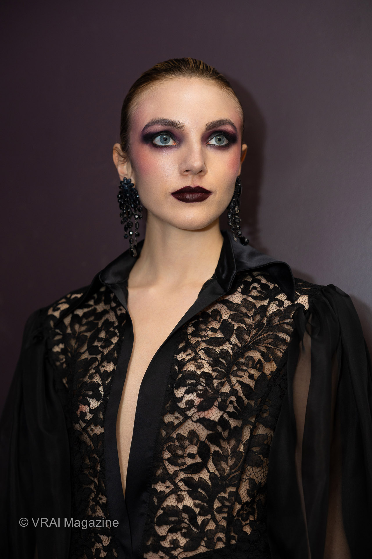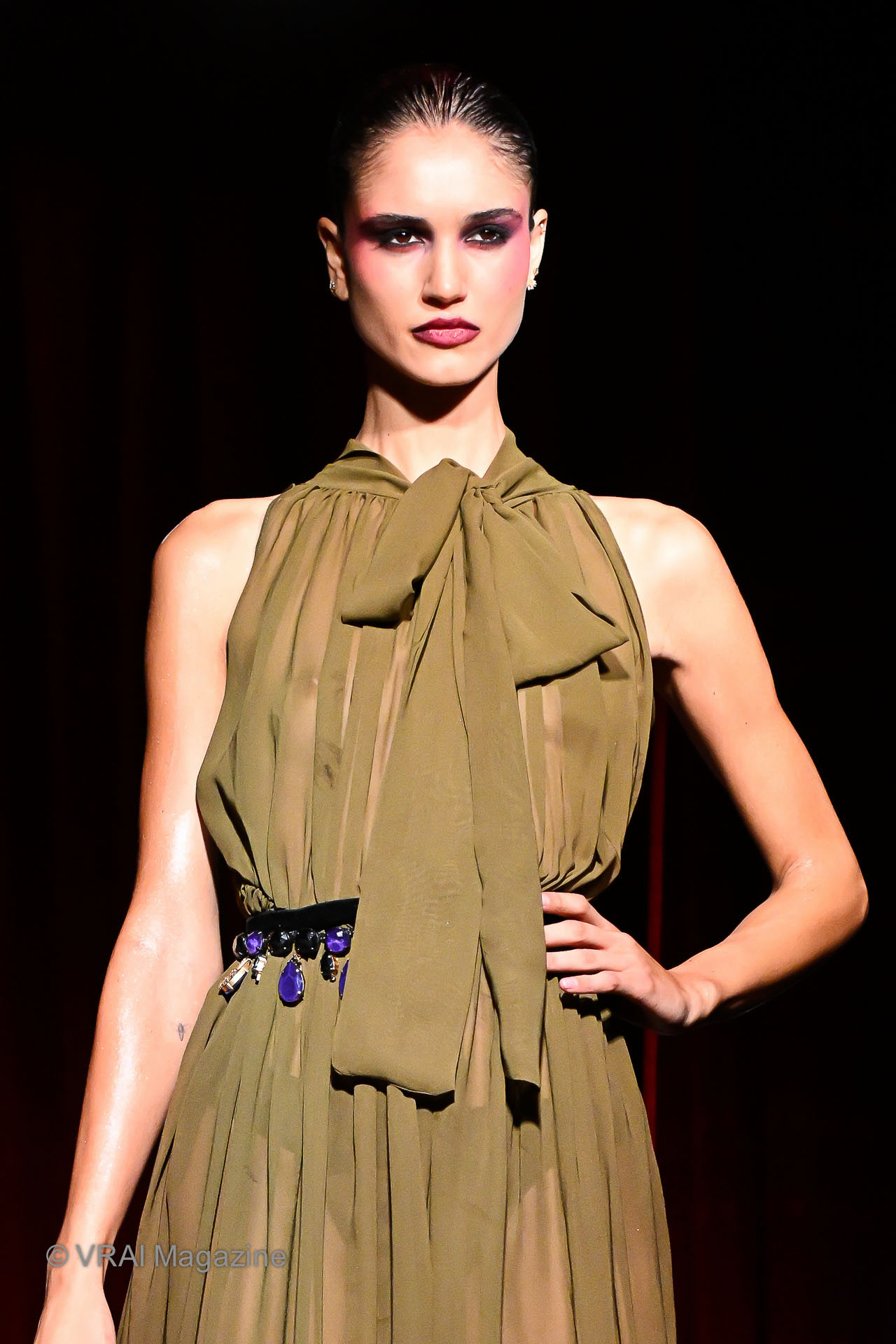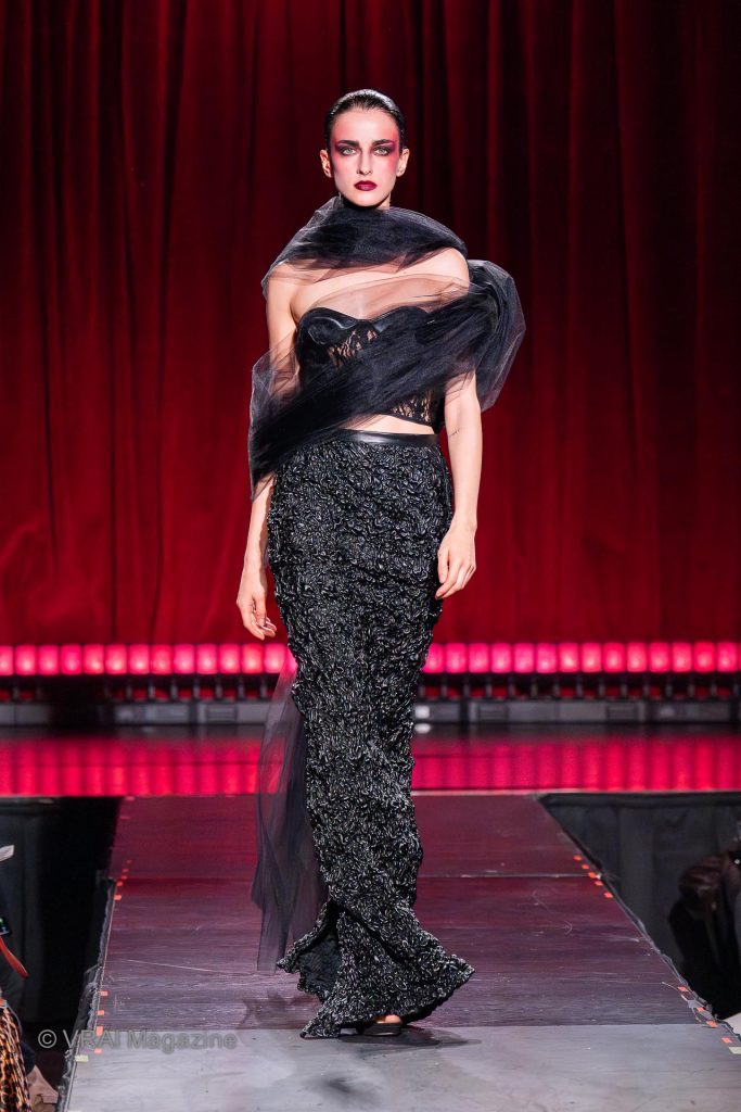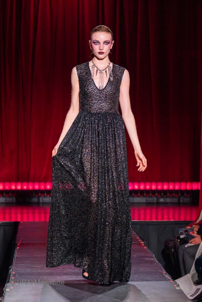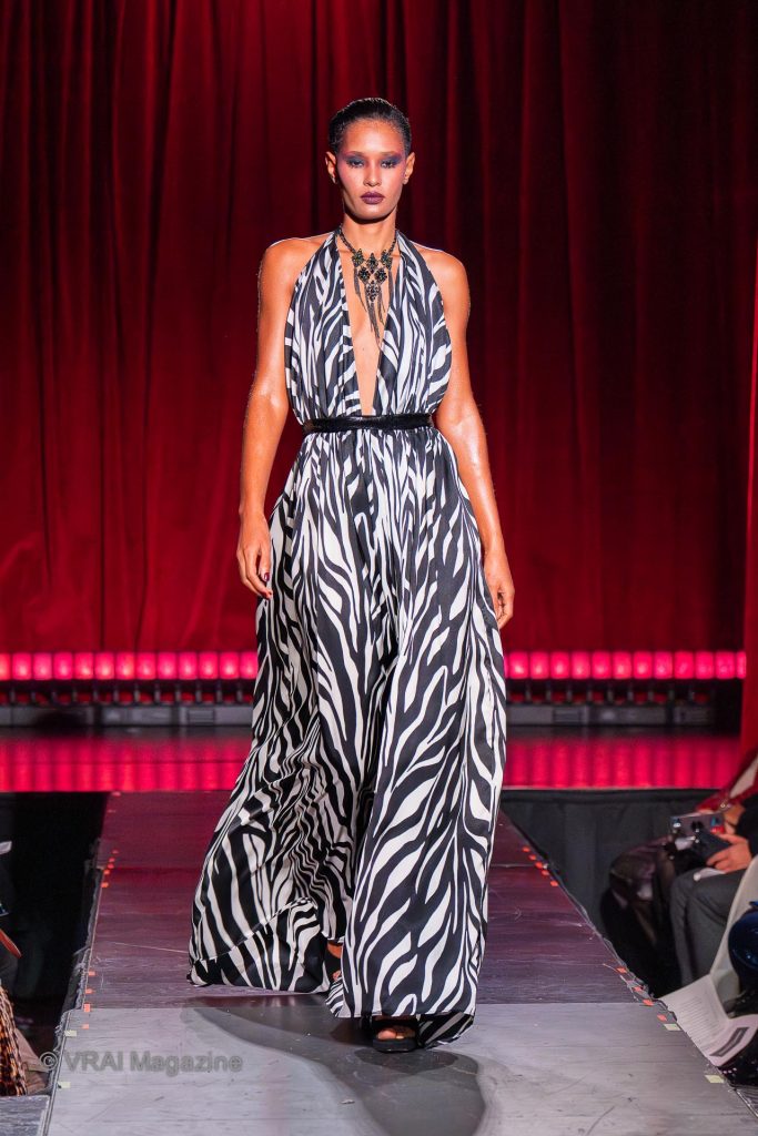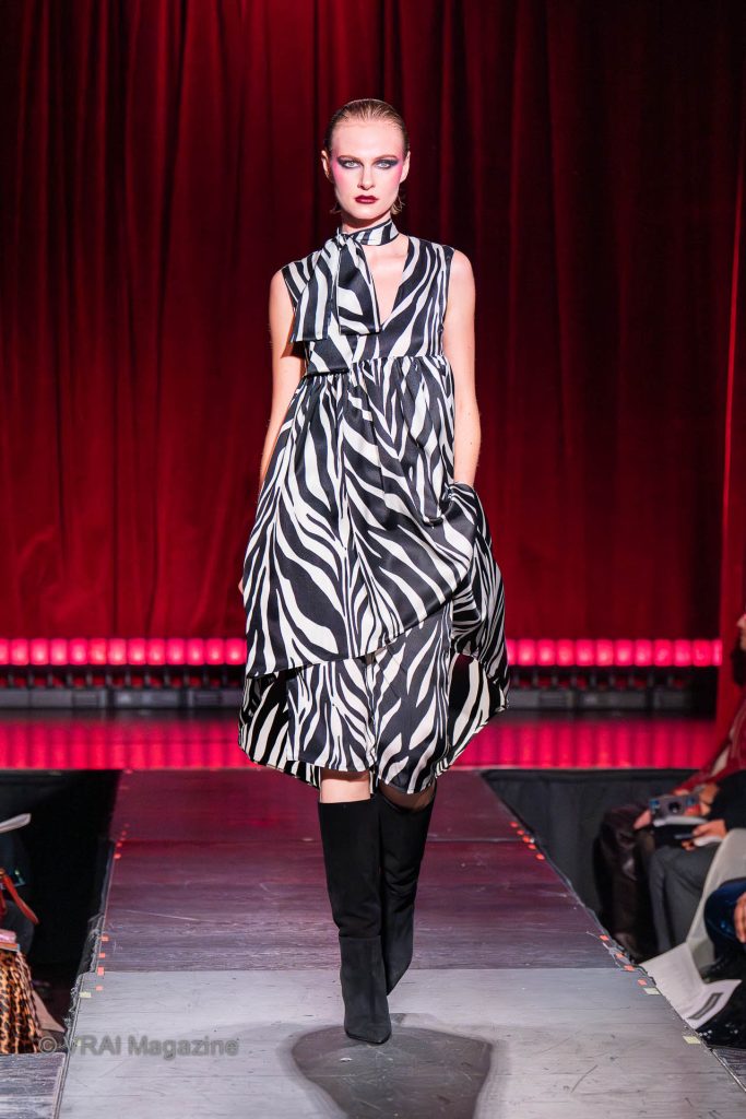 Anderson’s latest collection, a love letter to Spain and titled “Romance” was filled with intricate lace inspiration, a dark and moody palette of black, blood red and olive, zebra and floral prints, and sheer, seductive styling. The finale look was a halter dress in red with oversized bow and ruffles.