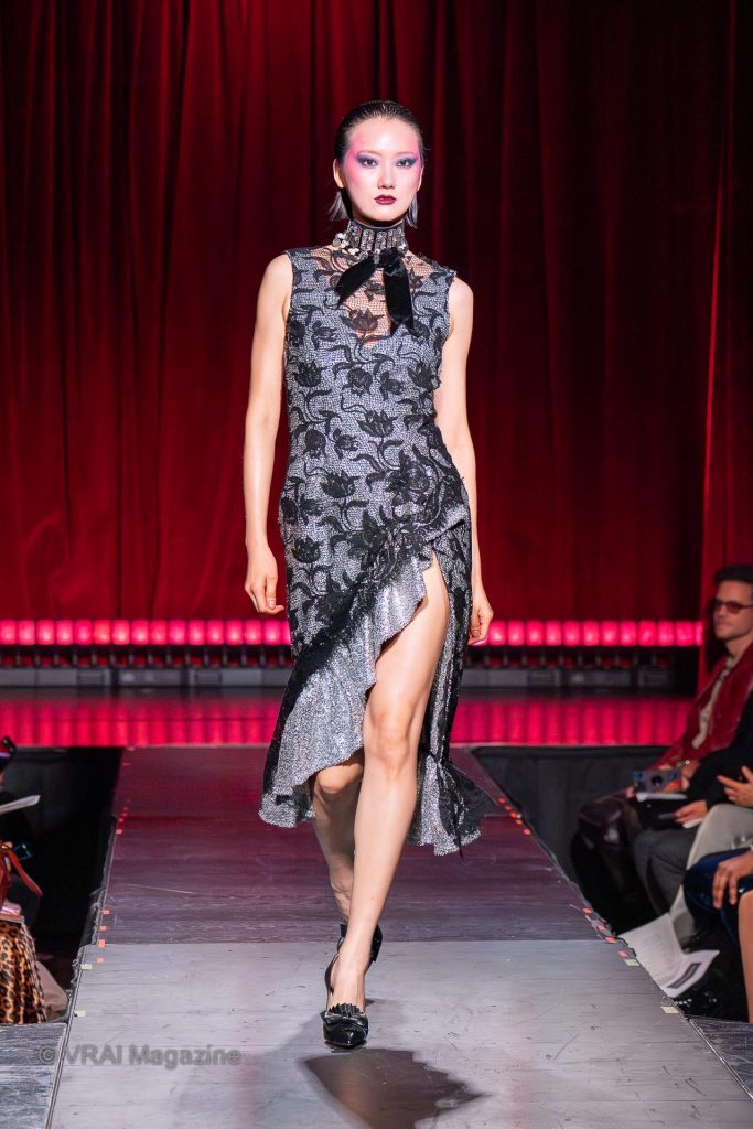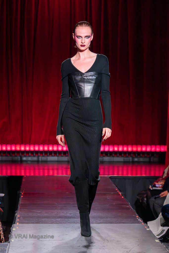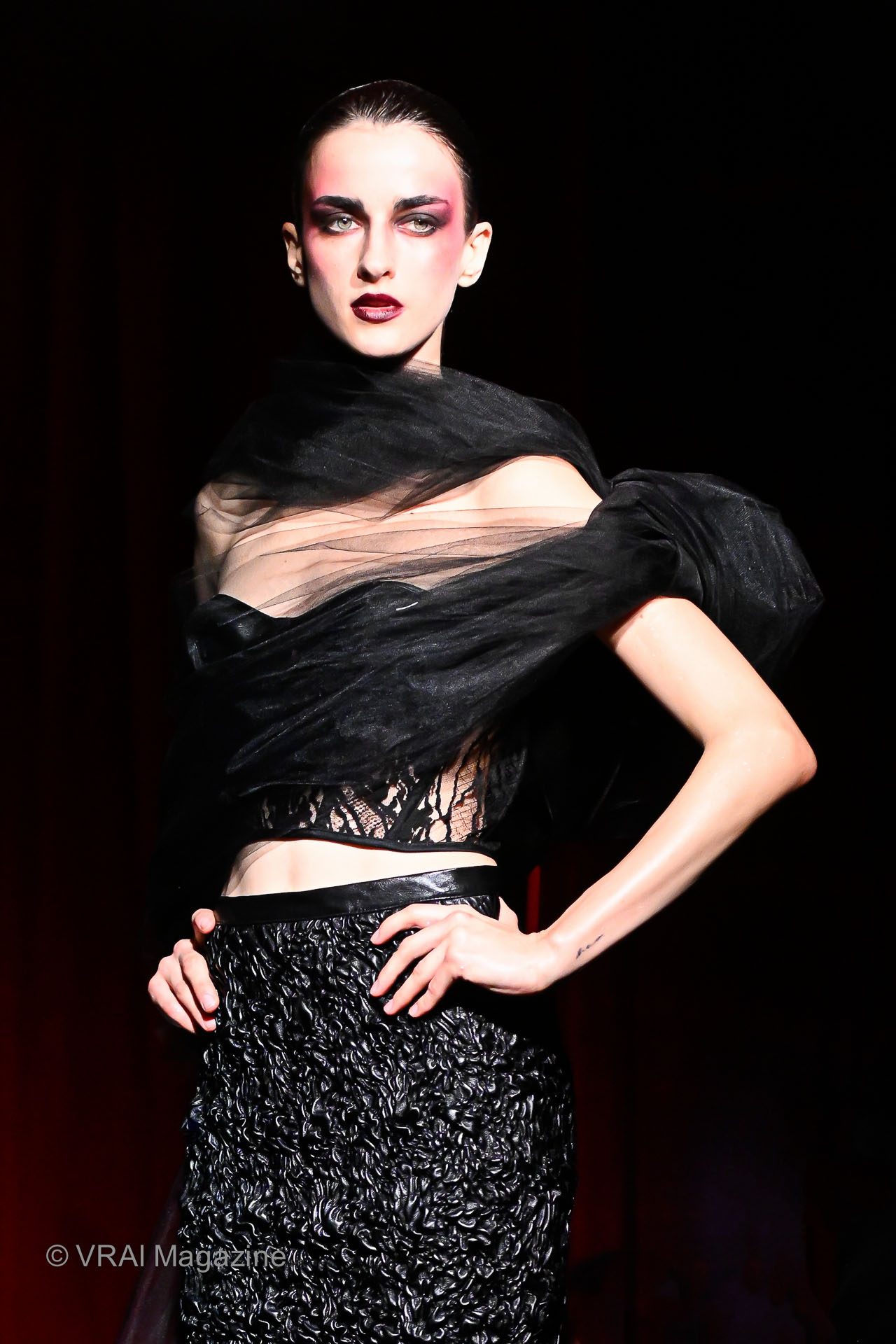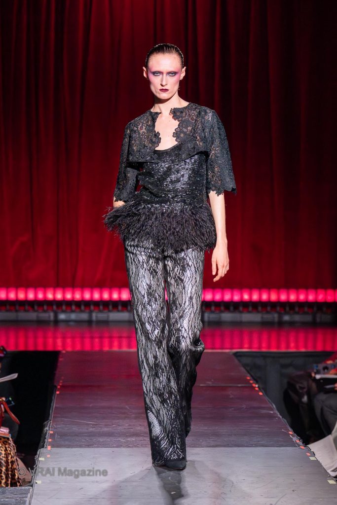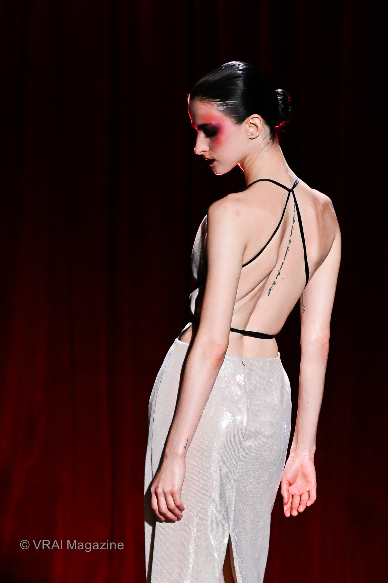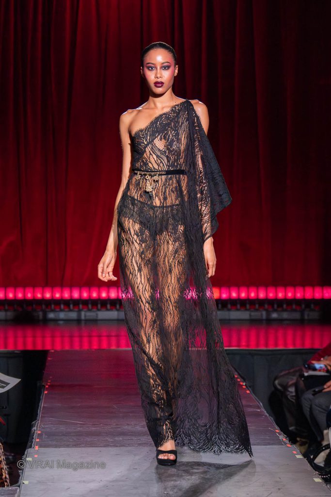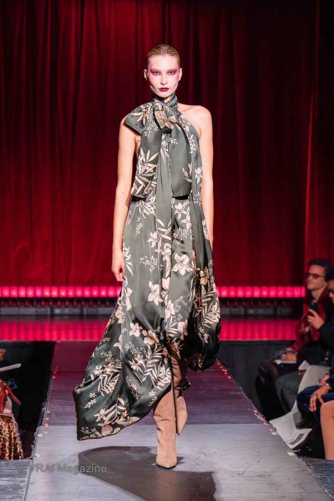 Anderson’s latest collection, a love letter to Spain and titled “Romance” was filled with intricate lace inspiration, a dark and moody palette of black, blood red and olive, zebra and floral prints, and sheer, seductive styling. The finale look was a halter dress in red with oversized bow and ruffles.