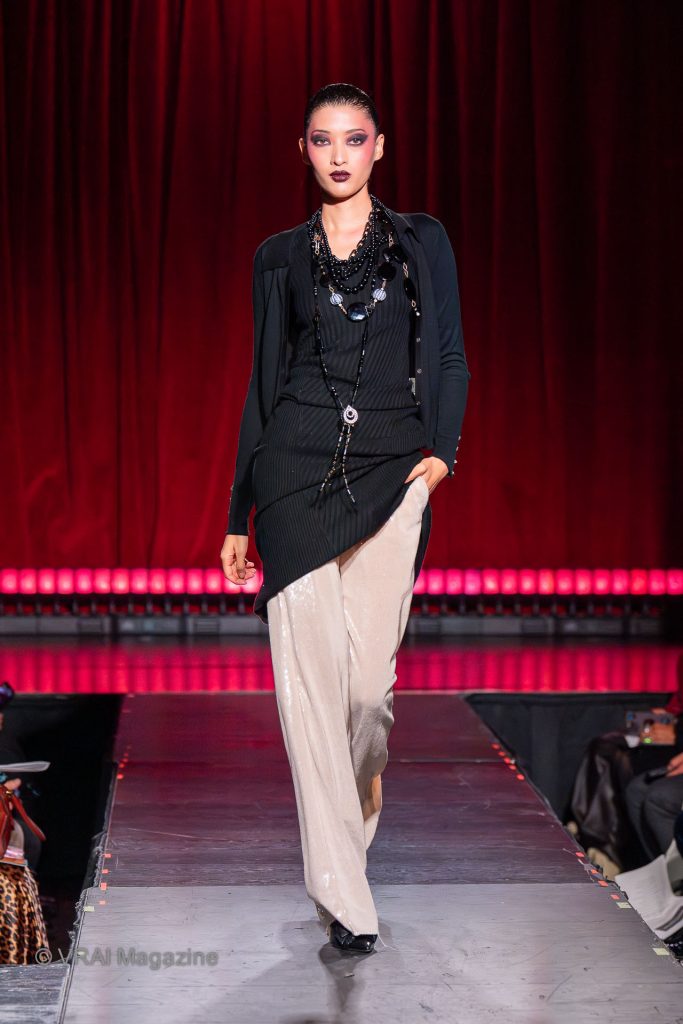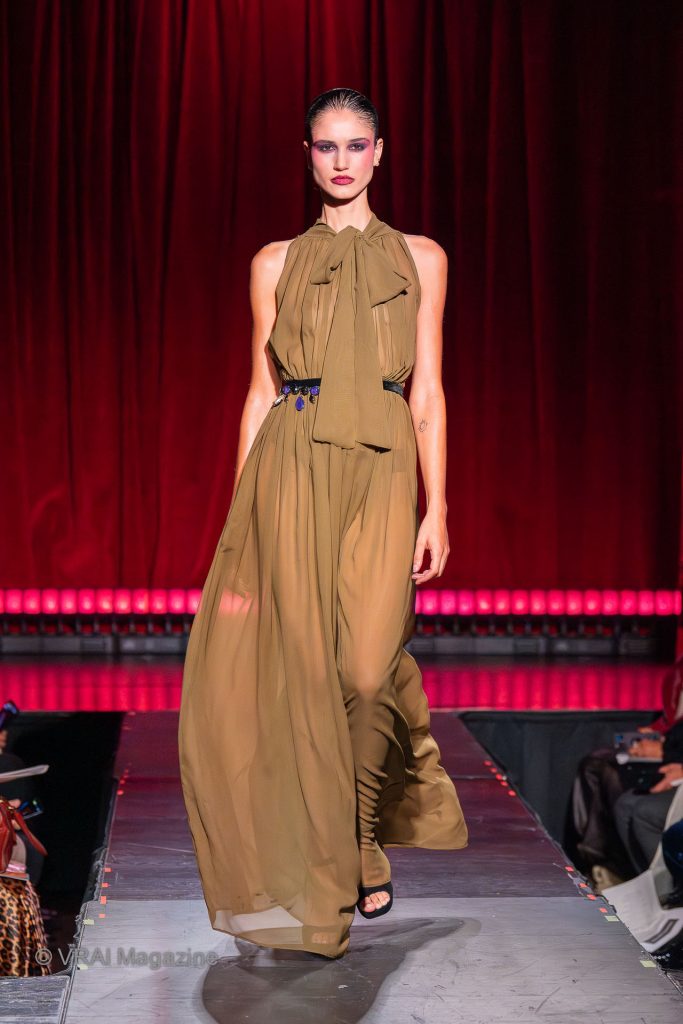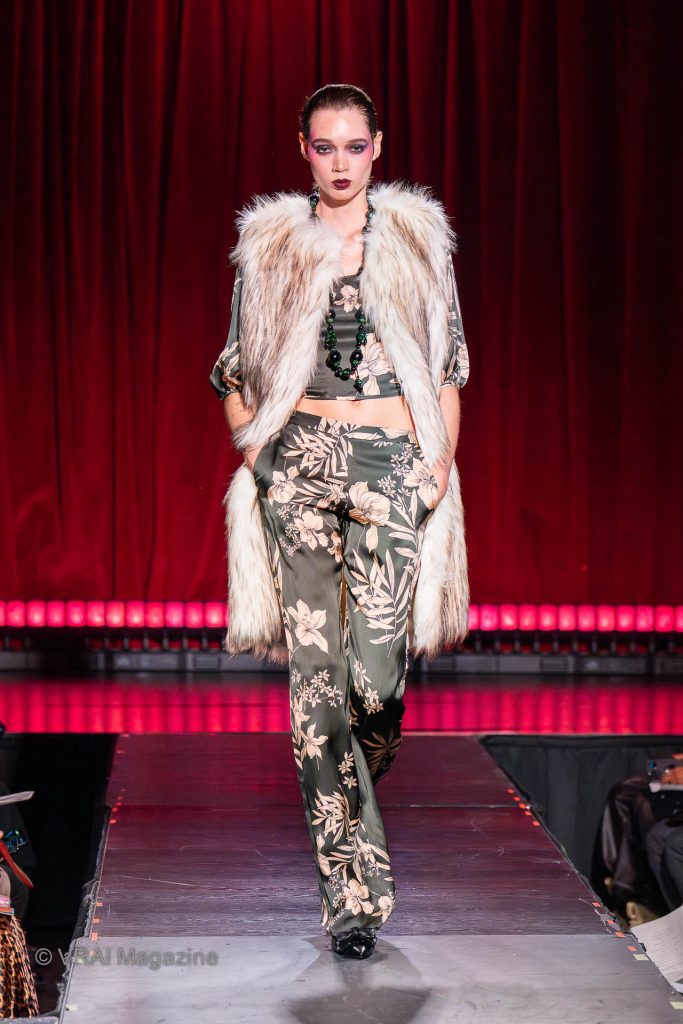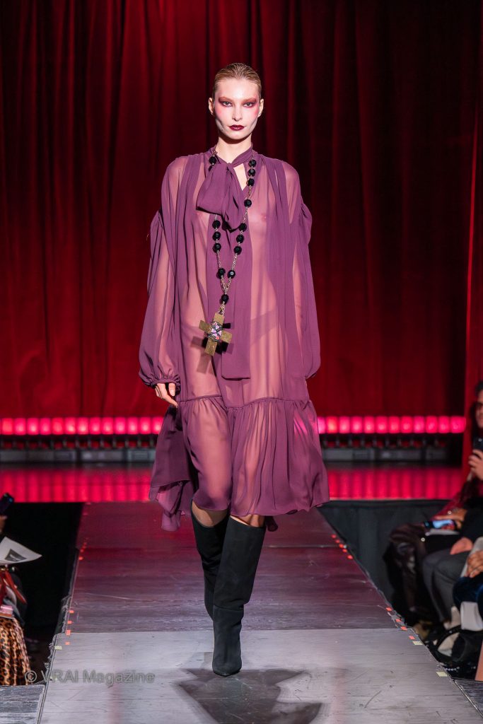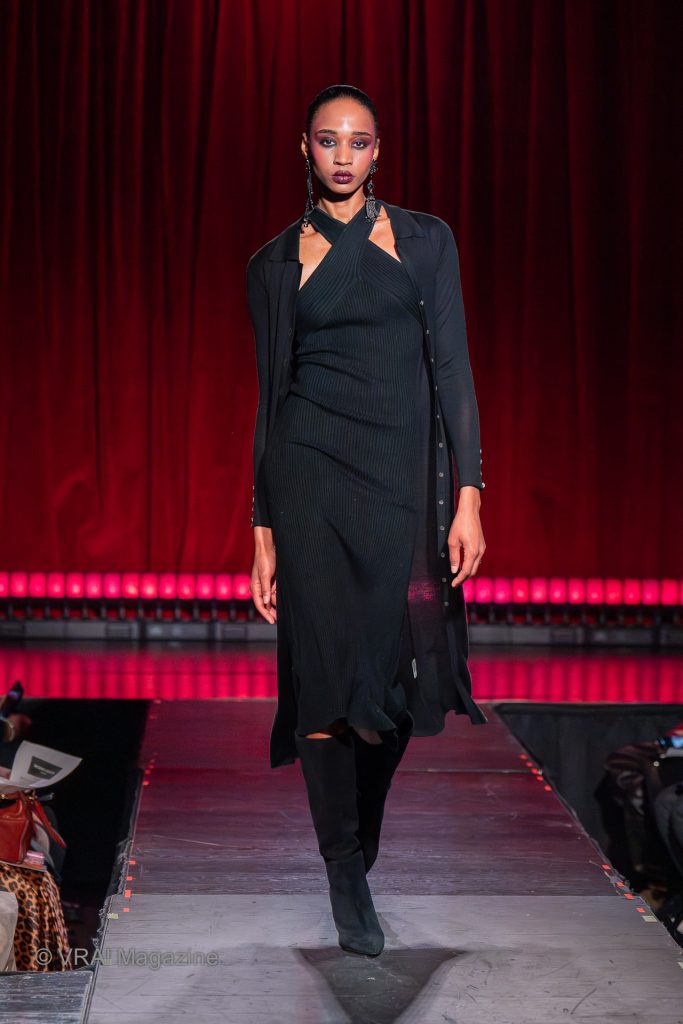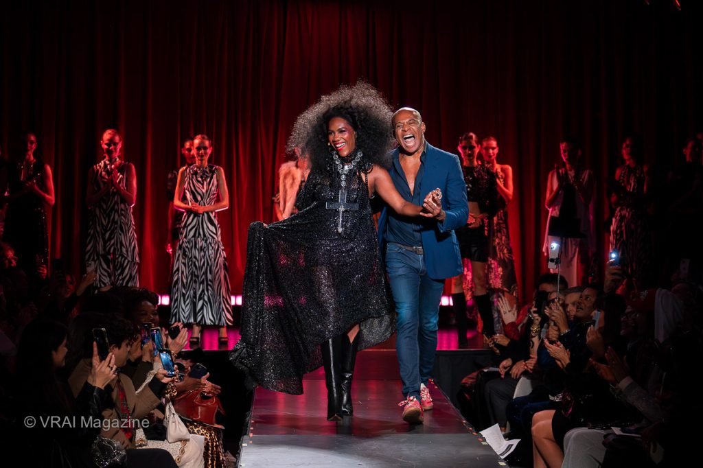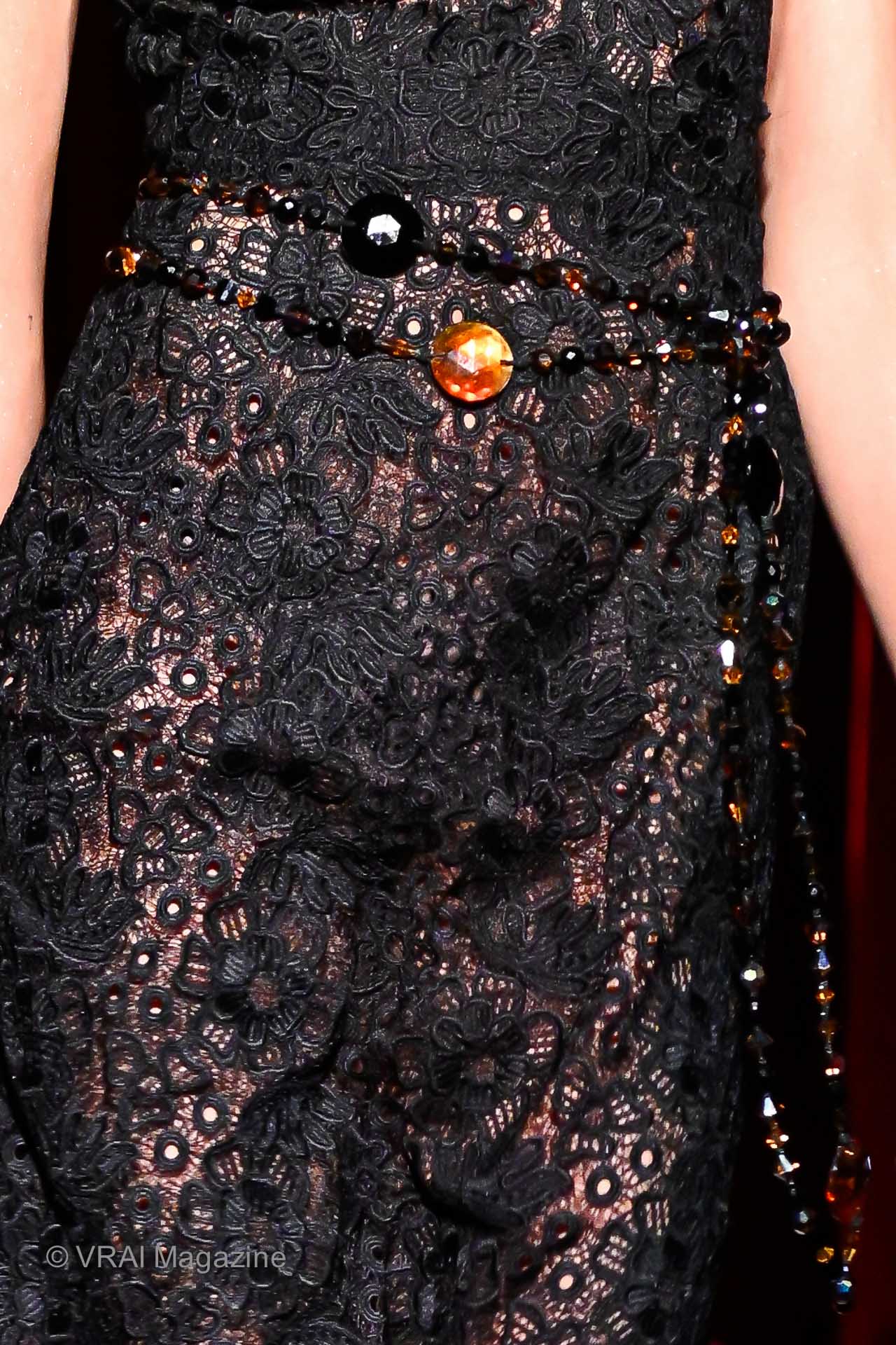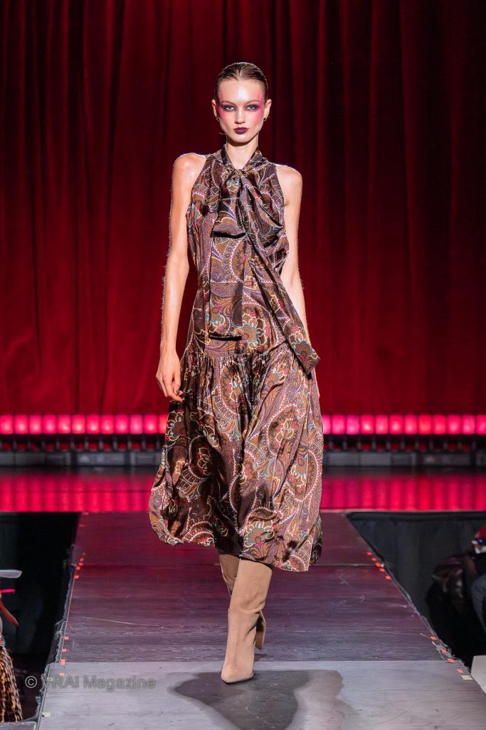 Anderson’s latest collection, a love letter to Spain and titled “Romance” was filled with intricate lace inspiration, a dark and moody palette of black, blood red and olive, zebra and floral prints, and sheer, seductive styling. The finale look was a halter dress in red with oversized bow and ruffles.