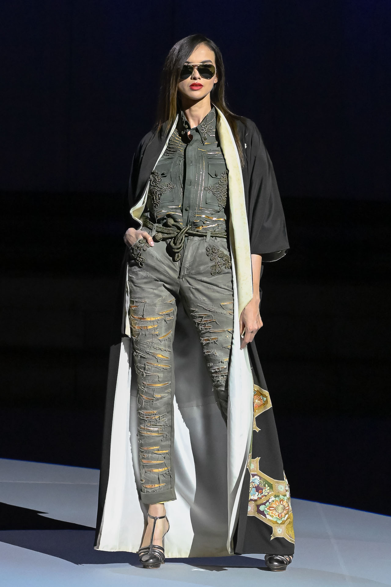 An overall color palette of rich, deep hues is accented with shimmer and shine, gradients, and delicate embroidery. Coordinating umbrellas also find their way as accessories for several looks.