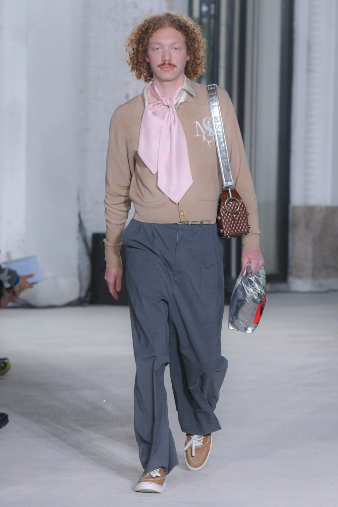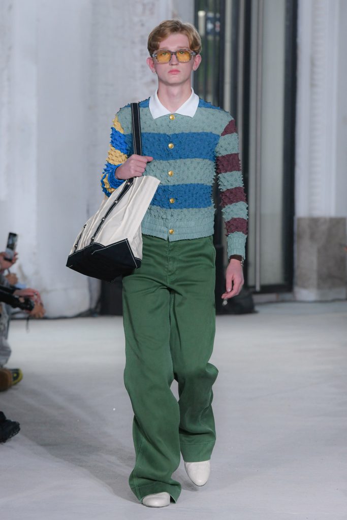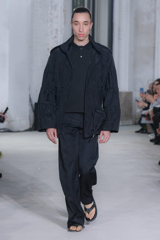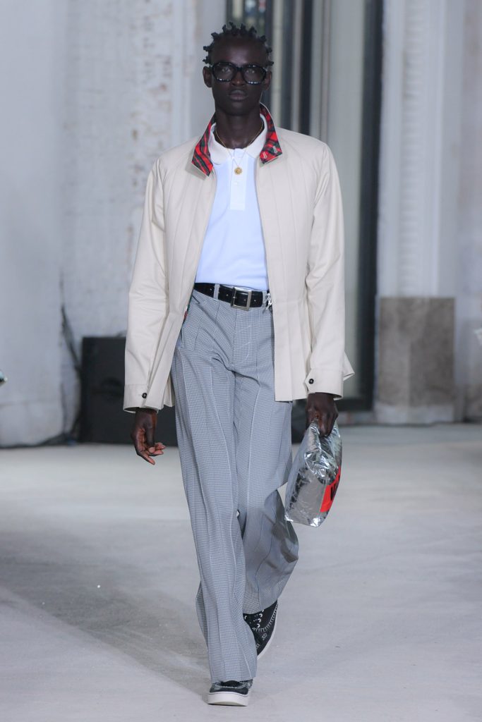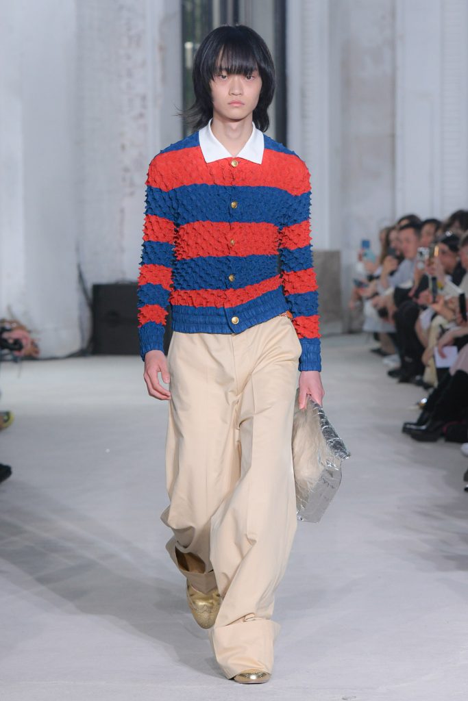 Dive into the menswear collection below and enjoy a runway moment showcasing a pleated jacket and a unique paper bag style clutch.