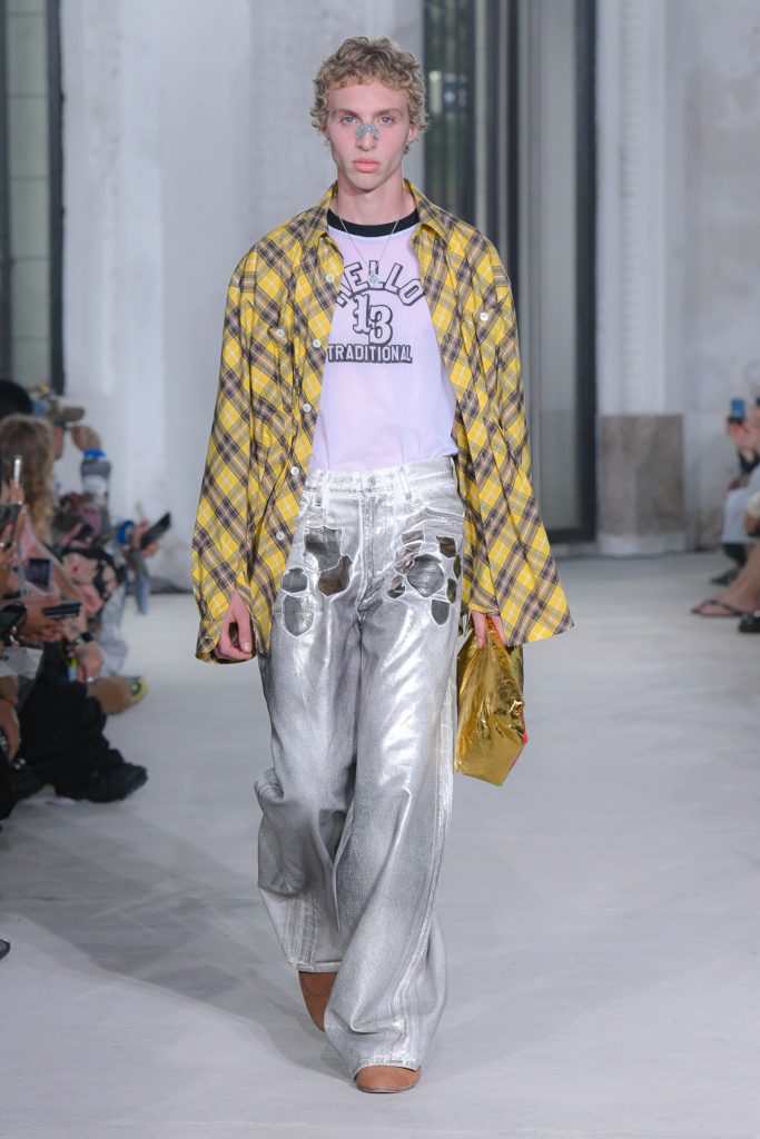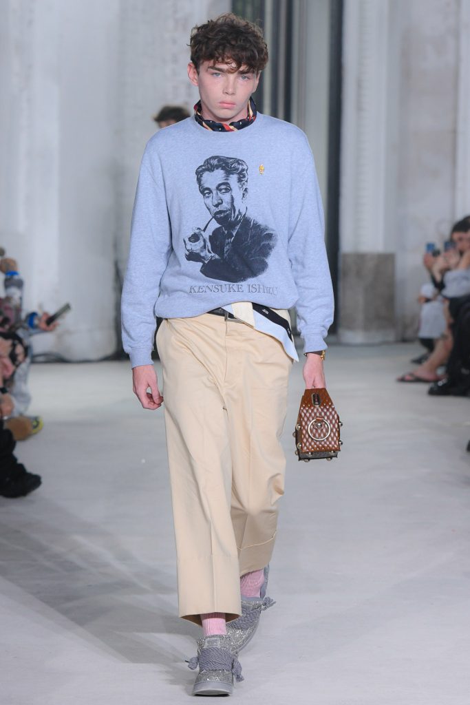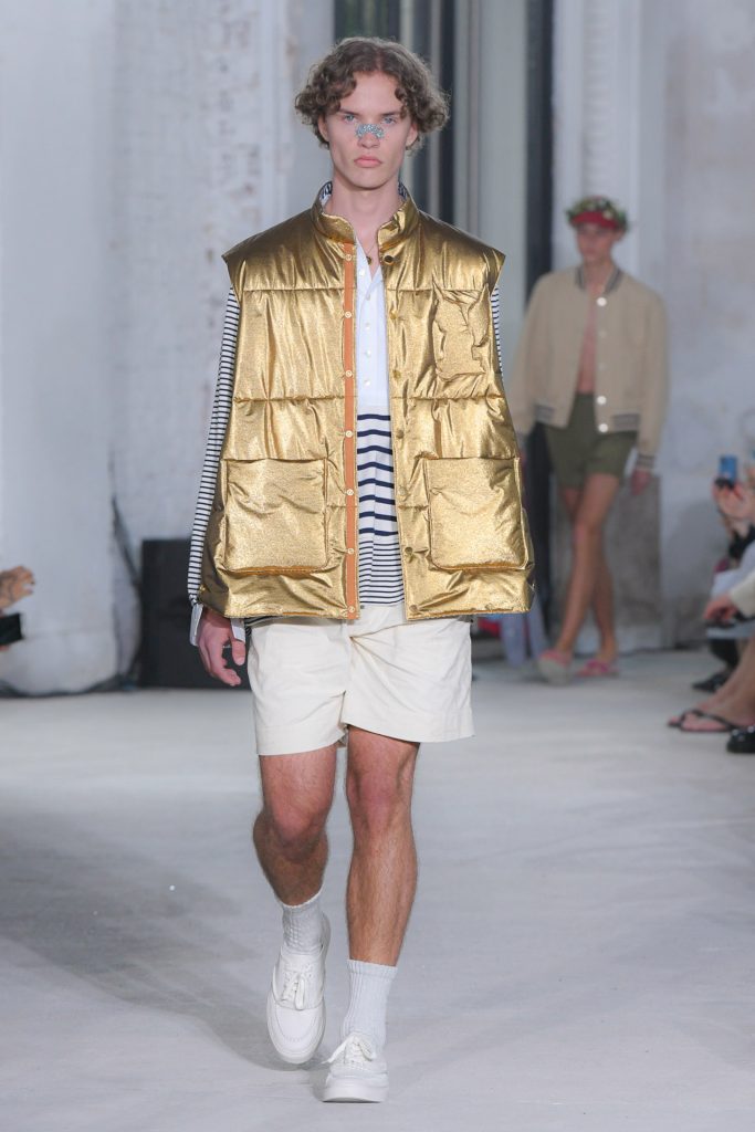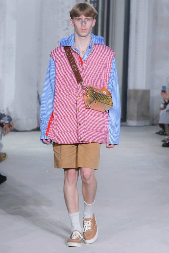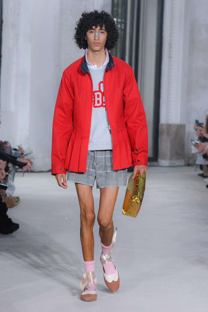 Dive into the menswear collection below and enjoy a runway moment showcasing a pleated jacket and a unique paper bag style clutch.