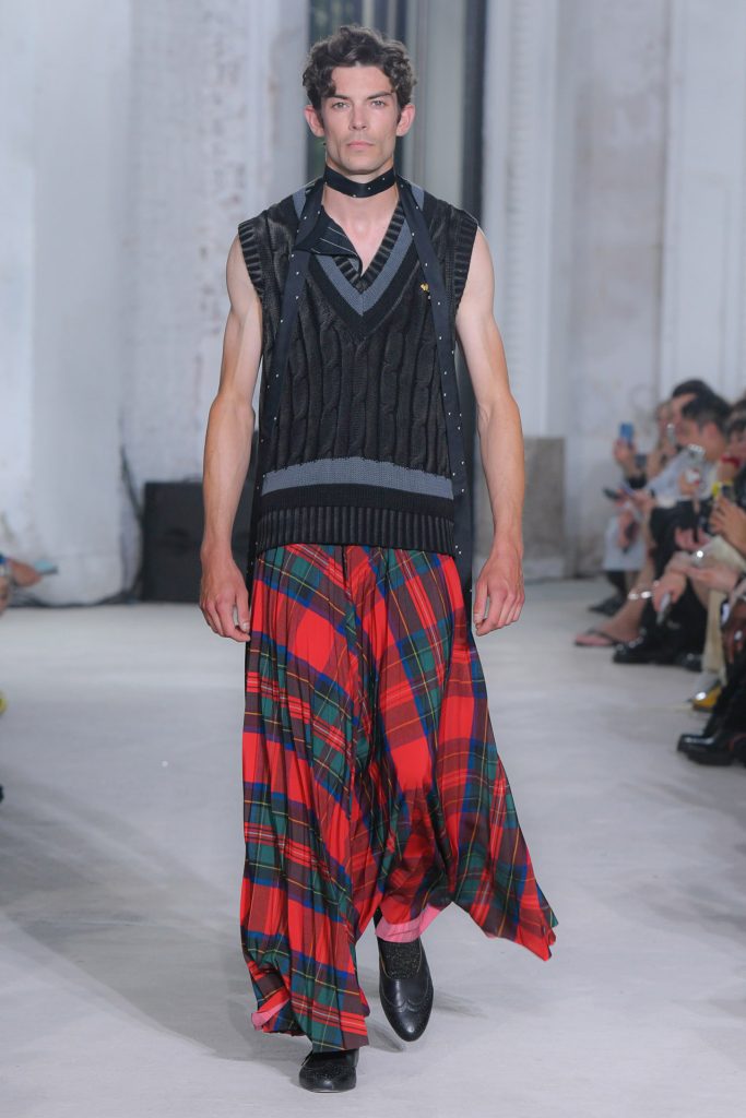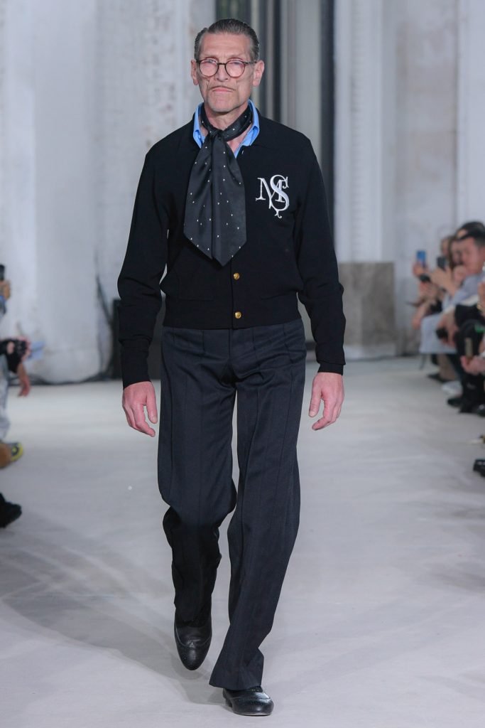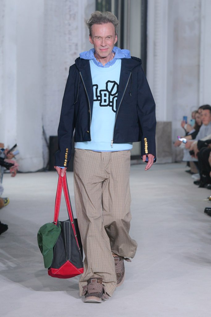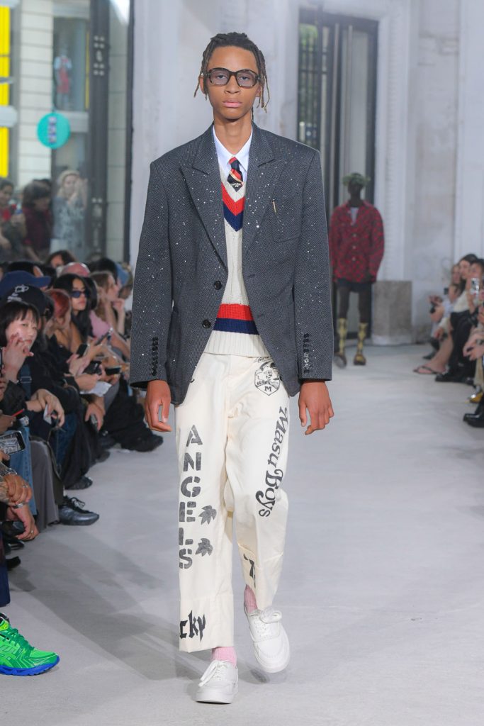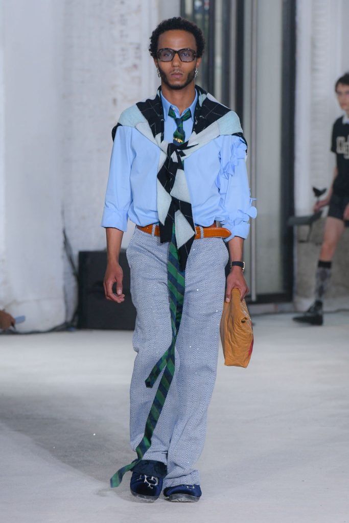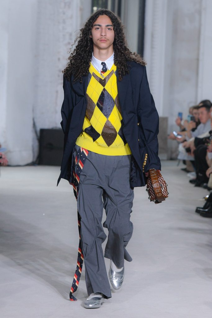 Textured sweaters kicked off the runway show and evolved to looks with blazers, exaggerated tie elements, ivy graphics, argyle and plaid.