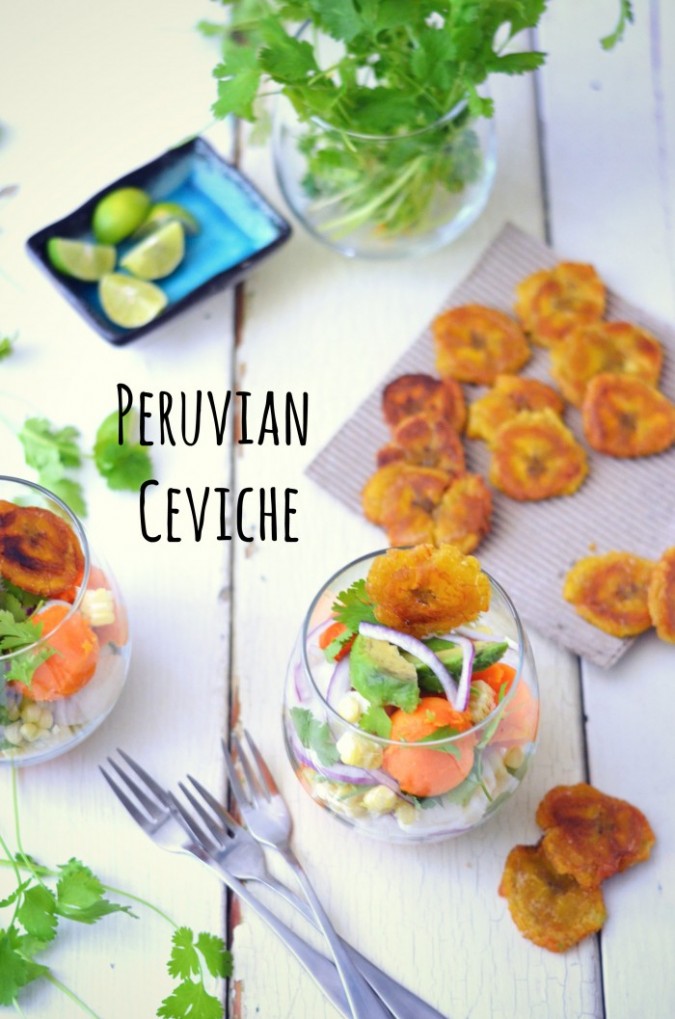 Adding to the dish thinly sliced red onions, sprigs of cilantro, scoops of baked sweet potato and bits of steamed or grilled corn completes this lovely Peruvian Ceviche. Serve it in glass bowls, dishes or over a bed of greens that have been tossed in a simple vinaigrette. My family loves this salad served with patacones (plantain chips). An absolute treat because I don’t make patacones often.