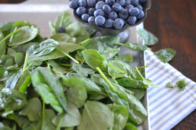 This is the time of year I love to get creative. Grilling fruit or leafy greens for side dishes or salads. Pairing a variety of produce with meat, fish and poultry to create new combinations of flavors.[/text_output][line][/vc_column][/vc_row][vc_row inner_container=”true” no_margin=”true” padding_top=”0px” padding_bottom=”0px” border=”none”][vc_column width=”1/1″][columnize]One of my favorite dishes to prepare is a lunch or dinner salad paired with berries or stone fruit, baby greens, local goats cheese and nuts. I love mixing it up with a different fruit and leafy green each time, but I have to say, this Spinach and Blueberry Salad is one of my most savored combinations.
