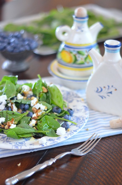 - Divide the spinach among 4-6 salad plates, top each plate with blueberries, crumbled chevre and toasted nuts. If serving family style, place the dressed spinach on a platter and then layer with blueberries, chevre and then the toasted nuts.