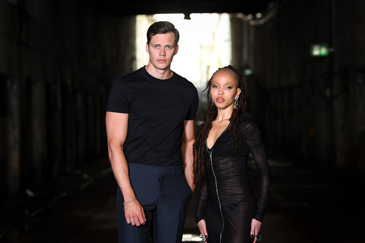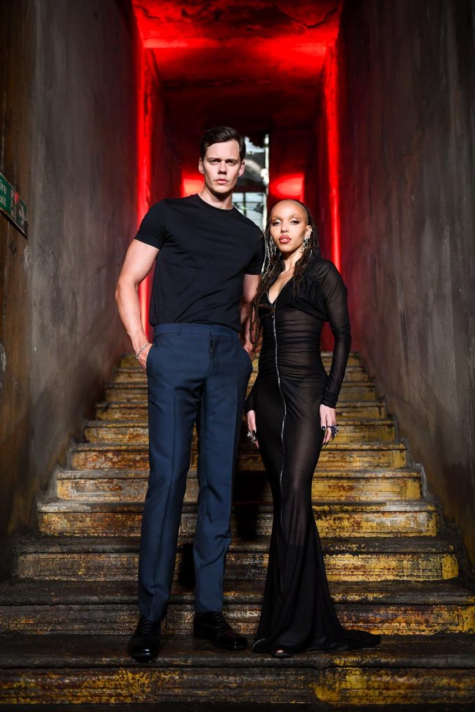 Stars Bill Skarsgård and FKA twigs (wearing Atlein) attend “The Crow” London photocall at the Kingsway Tram Tunnels on June 25, 2024 in London, England.