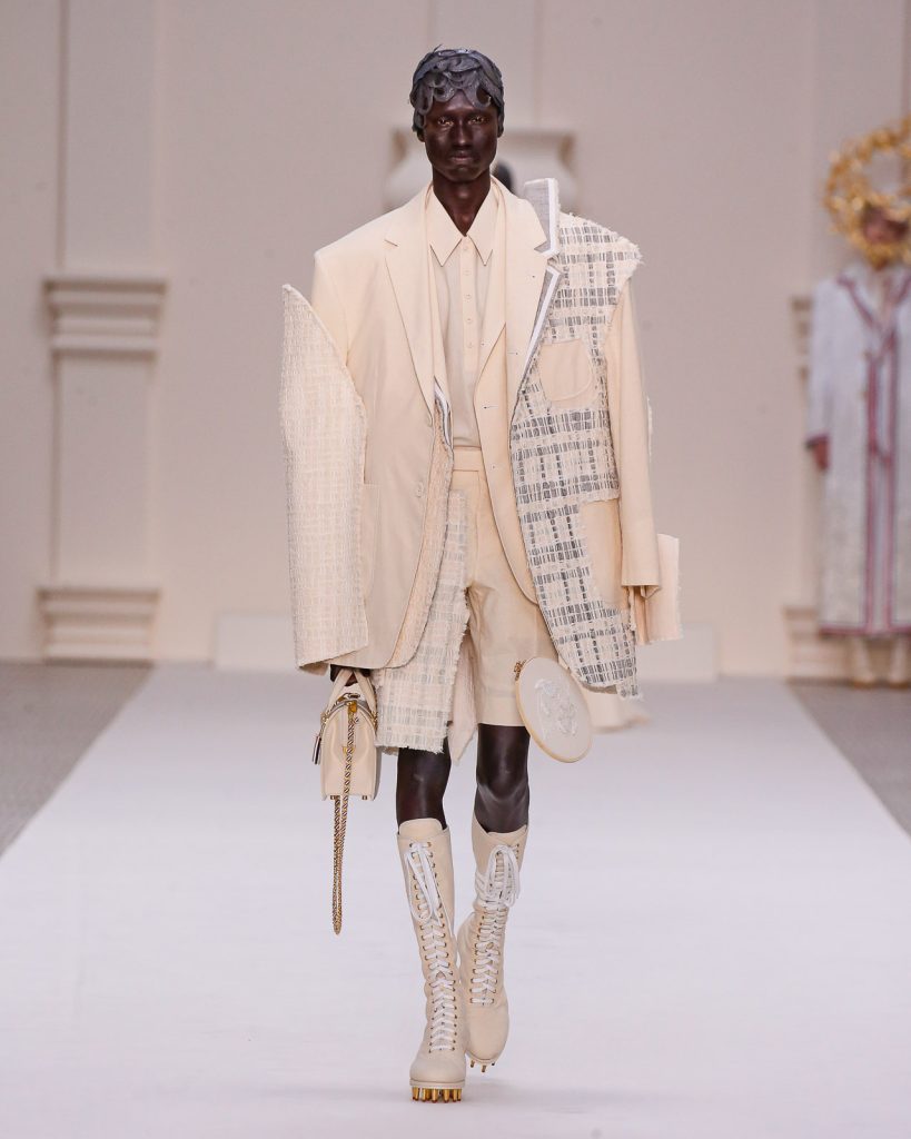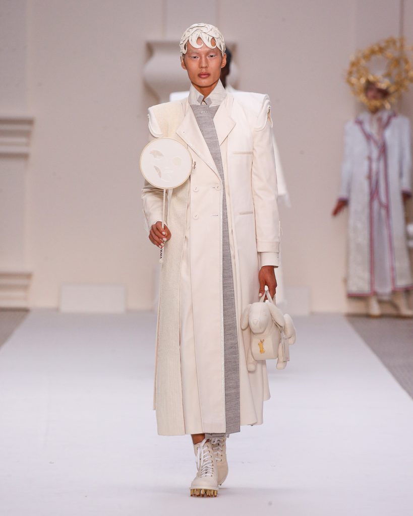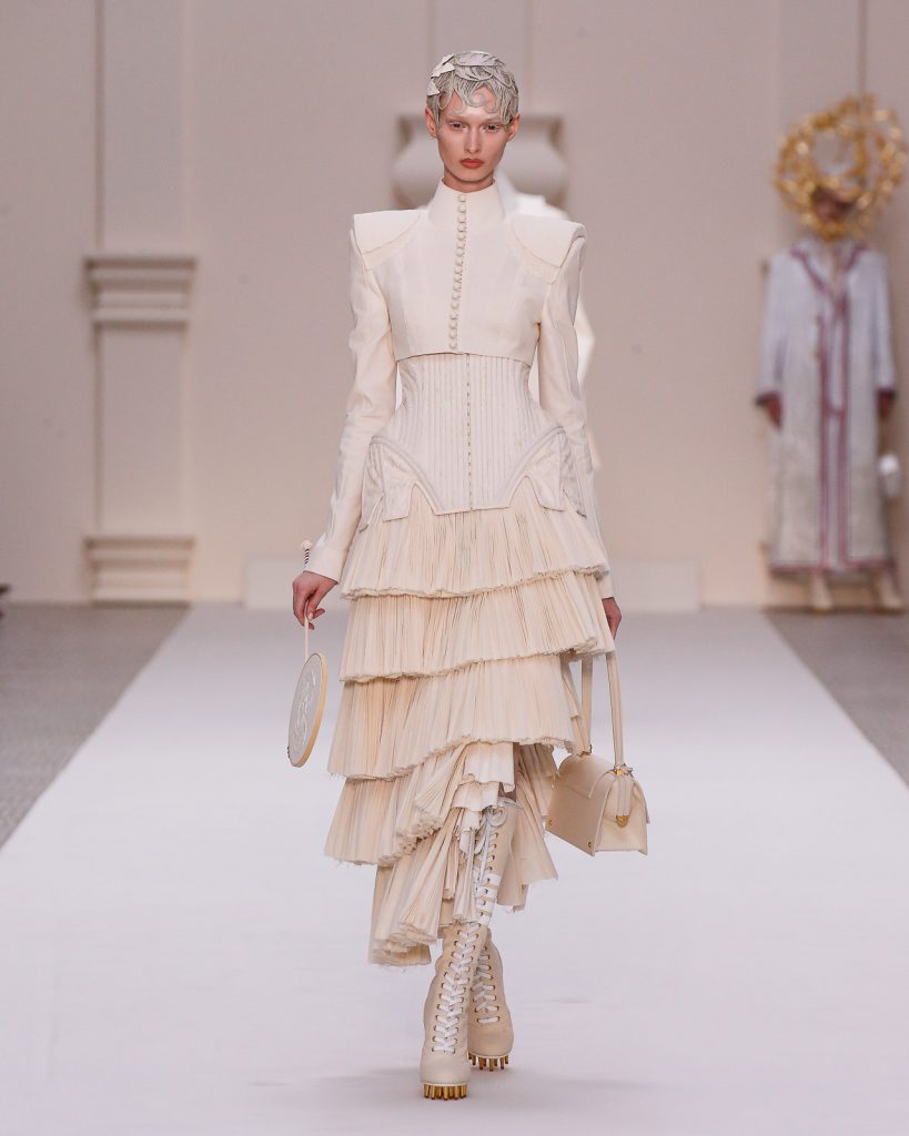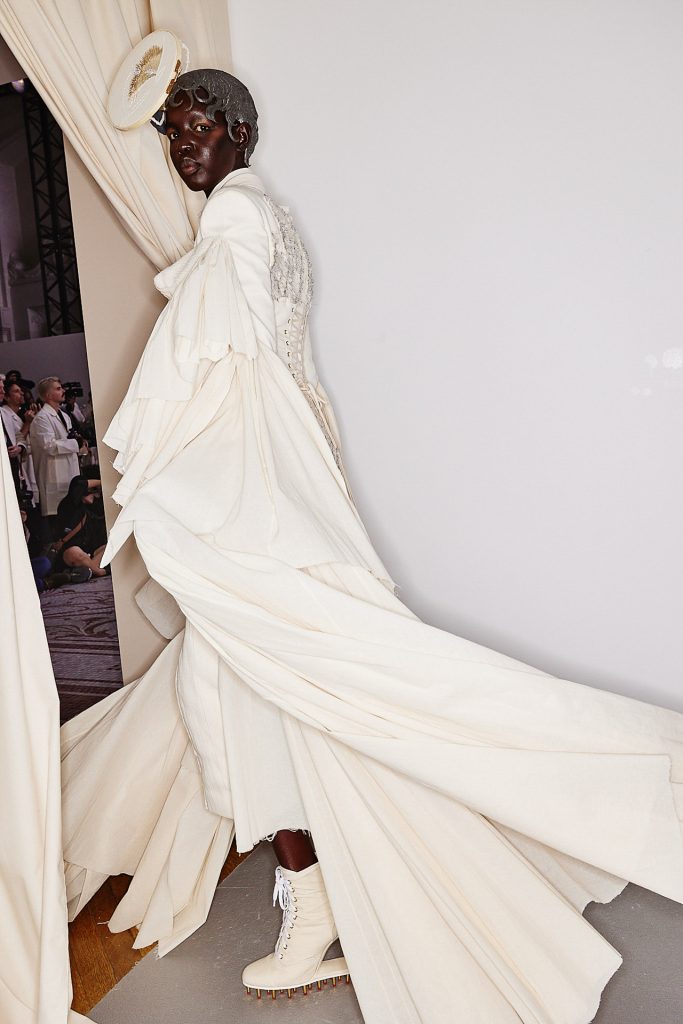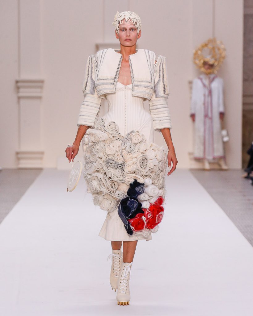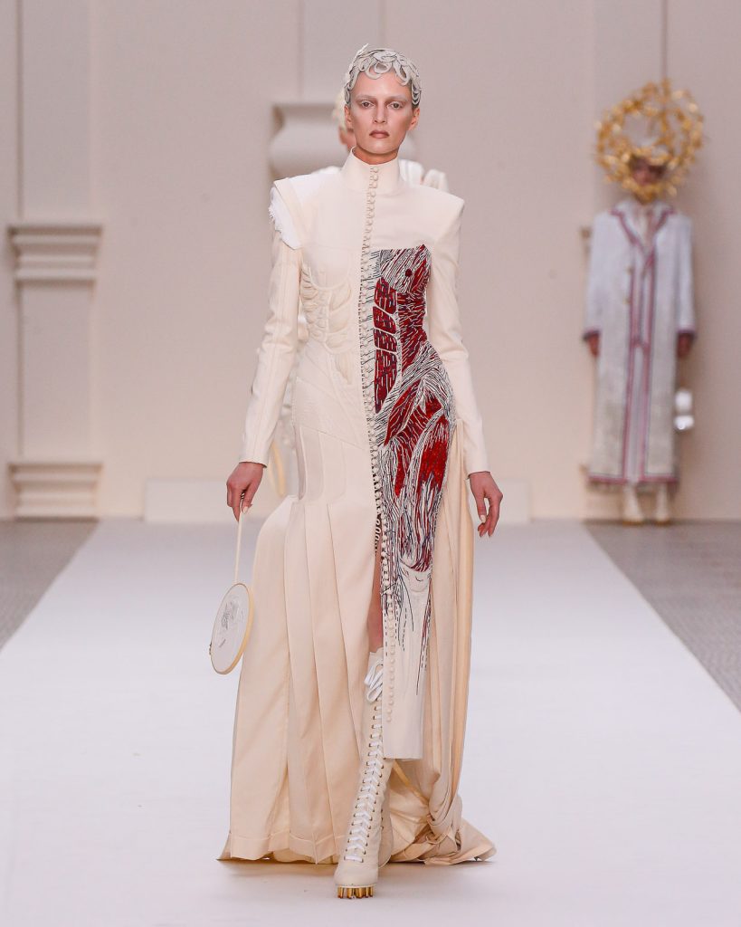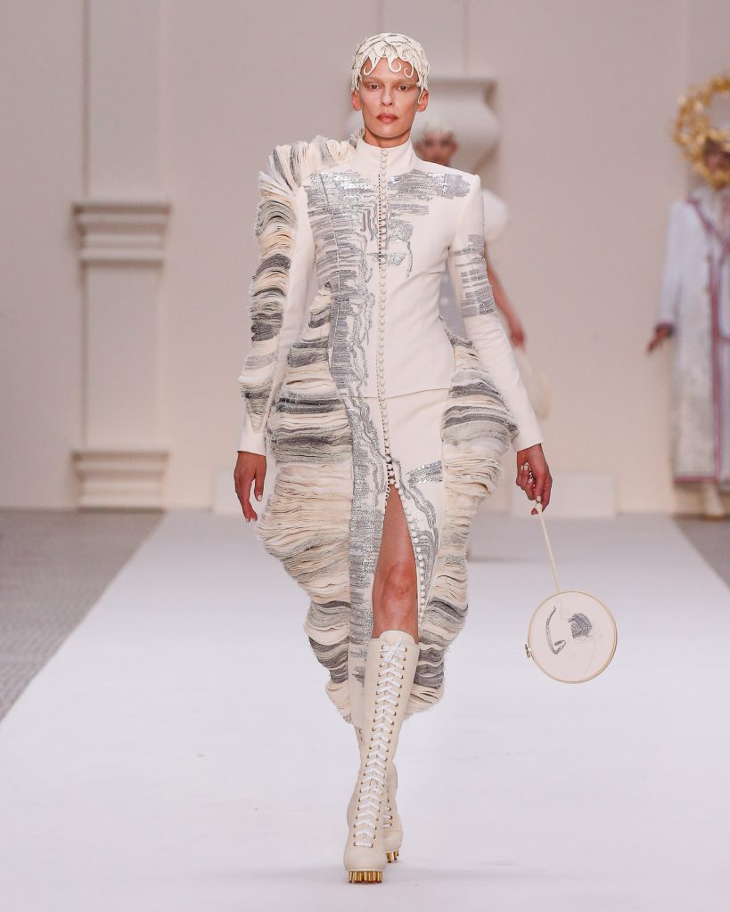 Monochromatic looks in varying weights of muslin and horsehair canvas, each with such depth, artistry and tailoring, paraded onto the runway. One sculptural look after another, 48 in total, emerged with Olympic and sporting motifs, down to the lace-up track heels and boots which replicate a runner’s starting block.